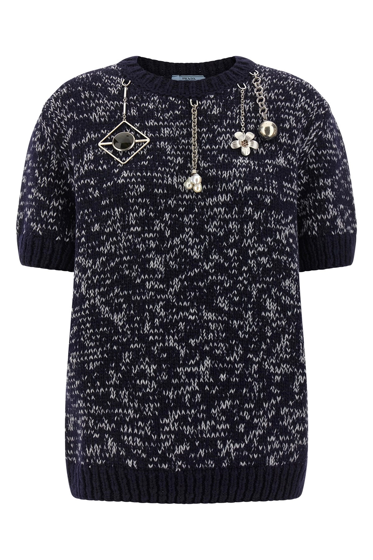 cod. P24U2ESOOO18HHF022X Wool sweater, dense weave workmanship, crew neck with metal pendants application detail, short sleeves. Color: Multicolor Size & Fit: True to size fit Composition: 100% virgin wool Made in: Italy