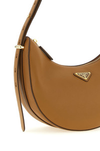 cod. 1BC274VOOO2CYSF03BH 'Prada Arque' smooth leather shoulder bag with crescent silhouette, front enameled metal triangle logo, top zip closure, adjustable shoulder strap. Color: Brown Size & Fit: W 27 x H 15 x D 8 cm Composition: 100% calfskin leather (Bos Taurus) Made in: Italy