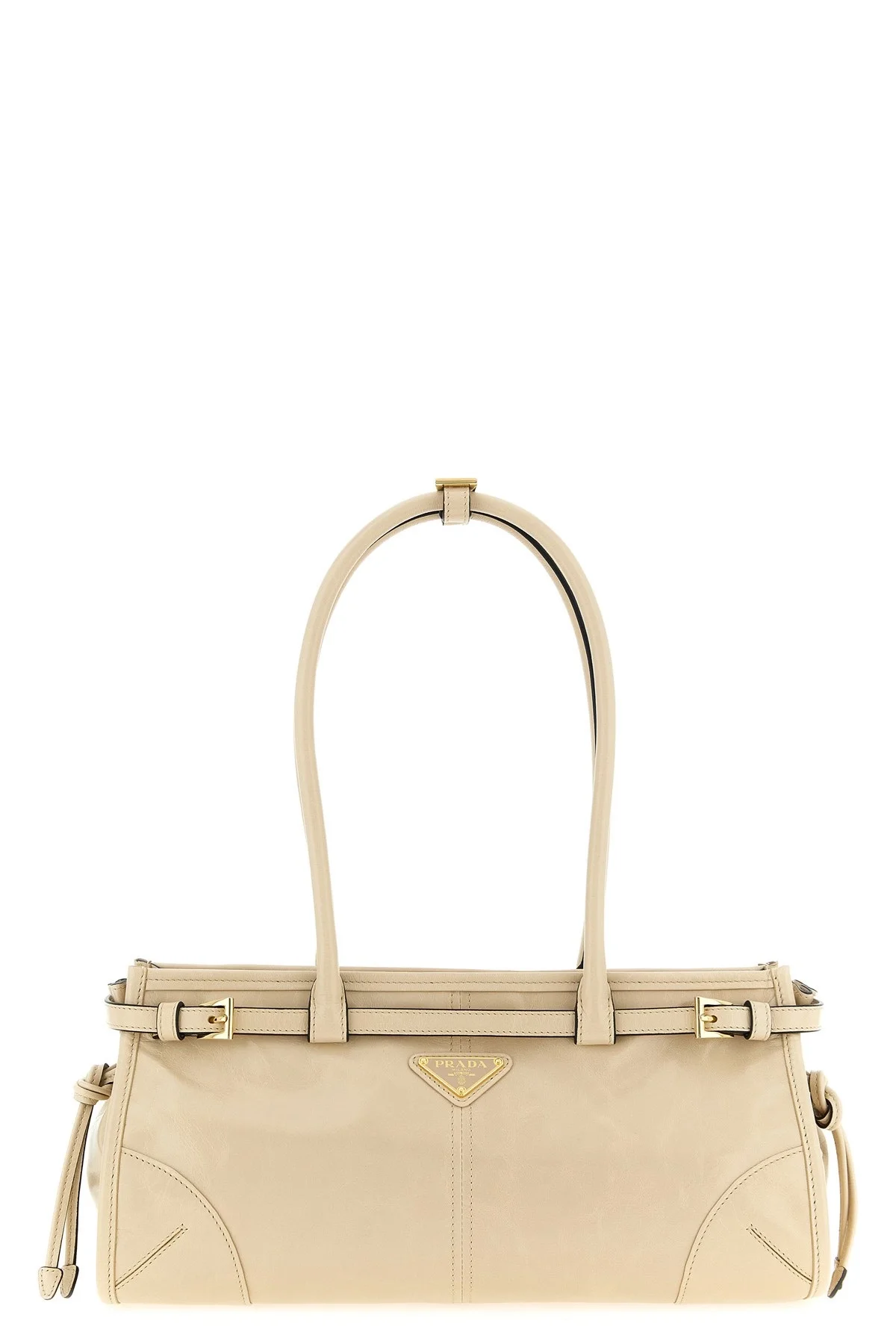 cod. 1BA426VMOO2CYRF03MV 'Prada Bonnie' leather handbag with polished finish, rectangular silhouette, front enameled metal triangle logo, adjustable strap detail, side drawstrings, double fixed tubular handle, top zip closure, nappa and nylon lining, adjustable and removable shoulder strap. Color: Beige Size & Fit: W 32 x H 15.5 x D 12 cm Composition: 100% calfskin leather (Bos Taurus) Made in: Italy