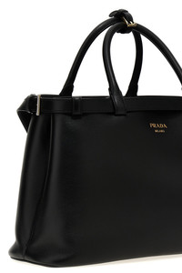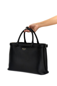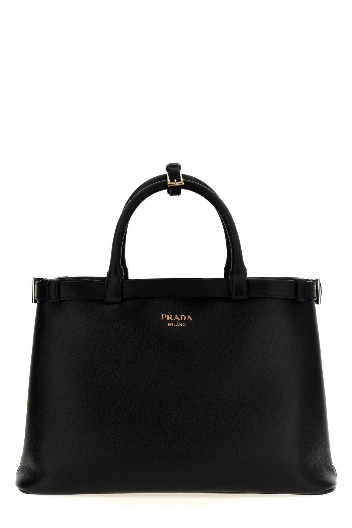 cod. 1BA417VOOO2CYSF0002 'Prada Buckle Medium' leather handbag with front embossed logo, belt detail, double handle with strap, adjustable and removable shoulder strap. Color: Black Size & Fit: W 35 x H 25 x D 14 cm Composition: 100% cow leather (Bos Taurus) Made in: Italy PROMO CODE NOT APPLICABLE