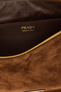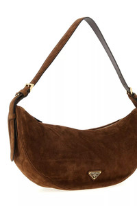 cod. 1BC255VOVO2C4SF0324 'Prada Demi-Lune' large suede shoulder bag, front enameled metal triangle logo, top zip closure, adjustable handle, removable keyring. Color: Brown Size & Fit: W 42 x H 19.5 x D 8.5 cm Composition: 100% calfskin leather (Bos Taurus) Made in: Italy