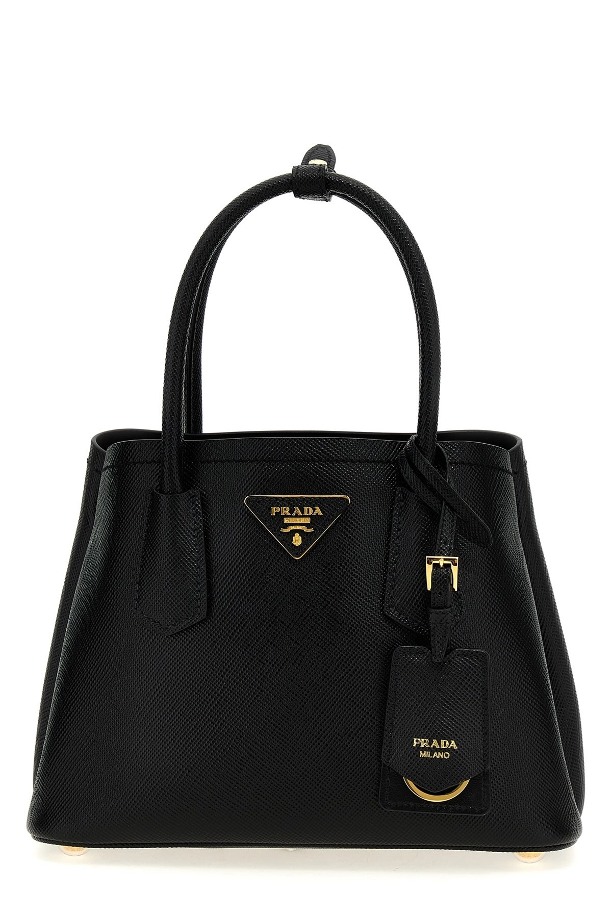 cod. 1BG443VXOG2A4AF0002 'Prada Double' mini handbag in Saffiano leather with front enameled metal triangle logo, double handle, removable keyring, adjustable and removable shoulder strap. Color: Black Size & Fit: W 25 x H 18.5 x D 12.5 cm Composition: 100% calfskin leather (Bos Taurus) Made in: Italy