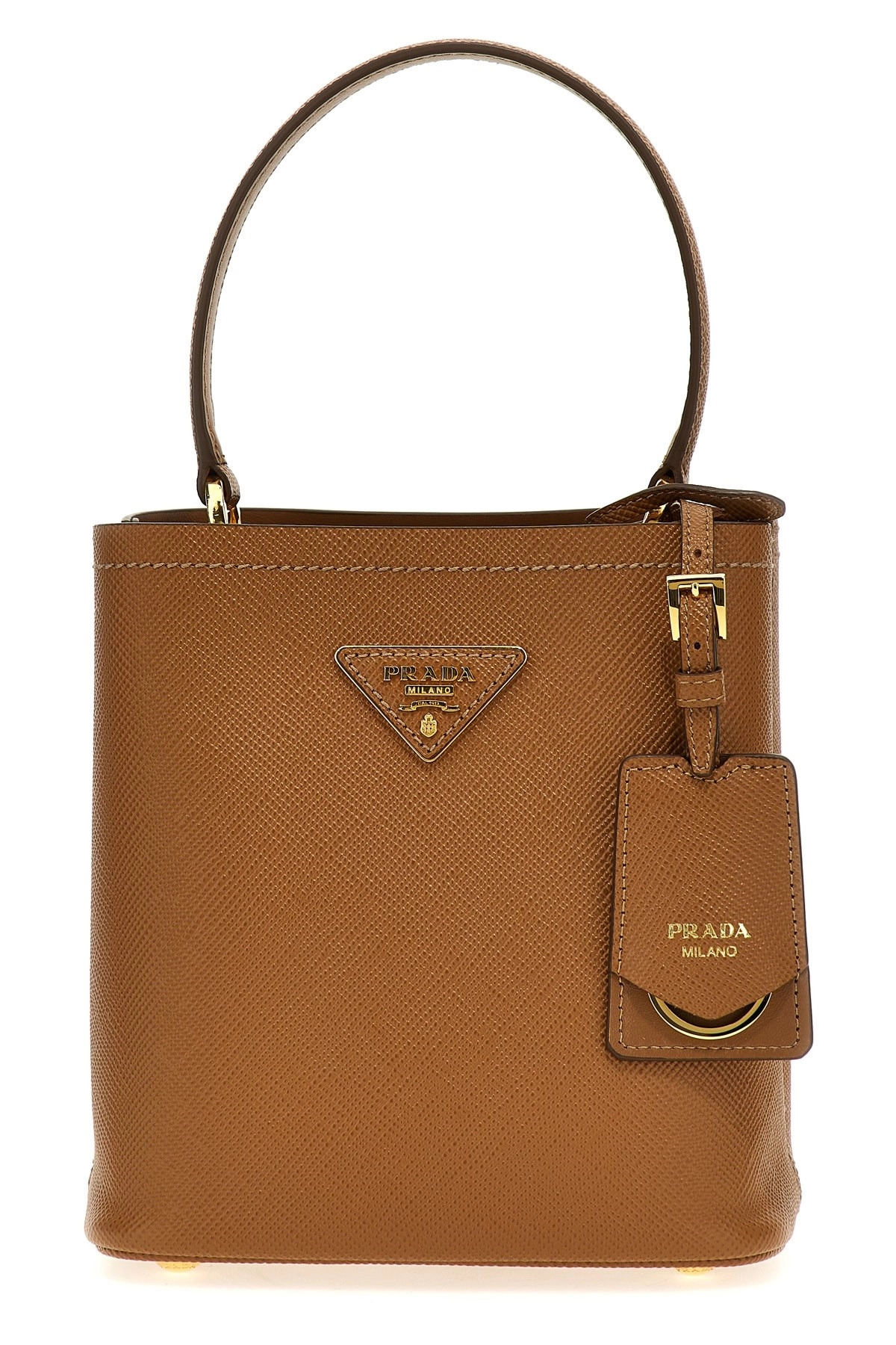 cod. 1BA217VOOD2ERXF03BH 'Prada Panier Small' Saffiano leather handbag with front enameled metal triangle logo, fixed handle, magnetic closure, metal details, removable name holder, adjustable and removable shoulder strap. Color: Brown Size & Fit: W 17 x H 18 x D 10.5 cm Composition: 100% calfskin leather (Bos Taurus) Made in: Italy