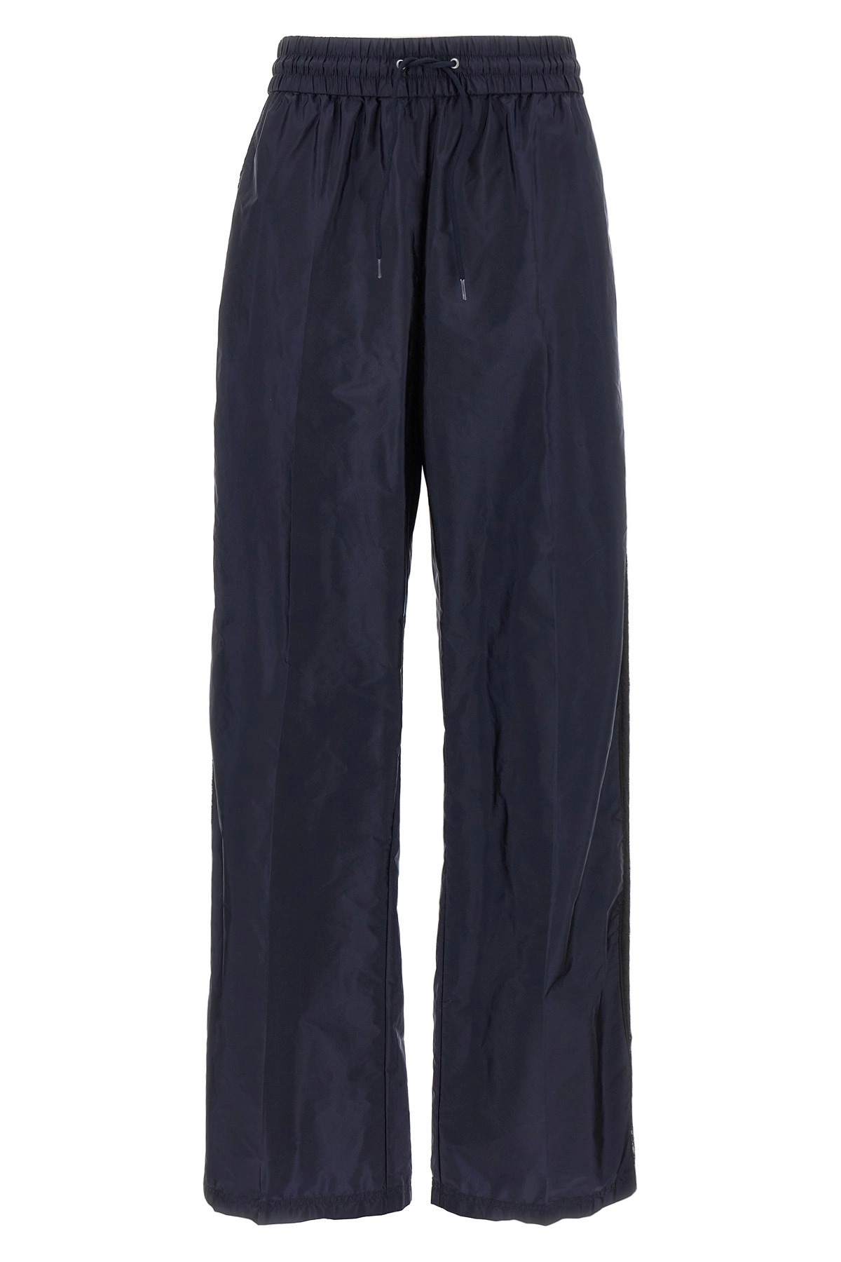 cod. 22X924SOOO1WQ9F0V41 Re-Nylon pants with lace inserts on the sides, adjustable drawstring elastic at the waist, pockets, wide and straight leg, enameled metal triangle logo on the back. SUSTAINABLE: This product is made with Re-Nylon, a regenerated yarn made from recycled and purified plastic collected in oceans, fishery nets and textile fibers. Color: Blue Size & Fit: true to size fit Composition: 100% polyamide Made in: Italy