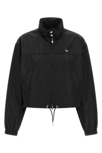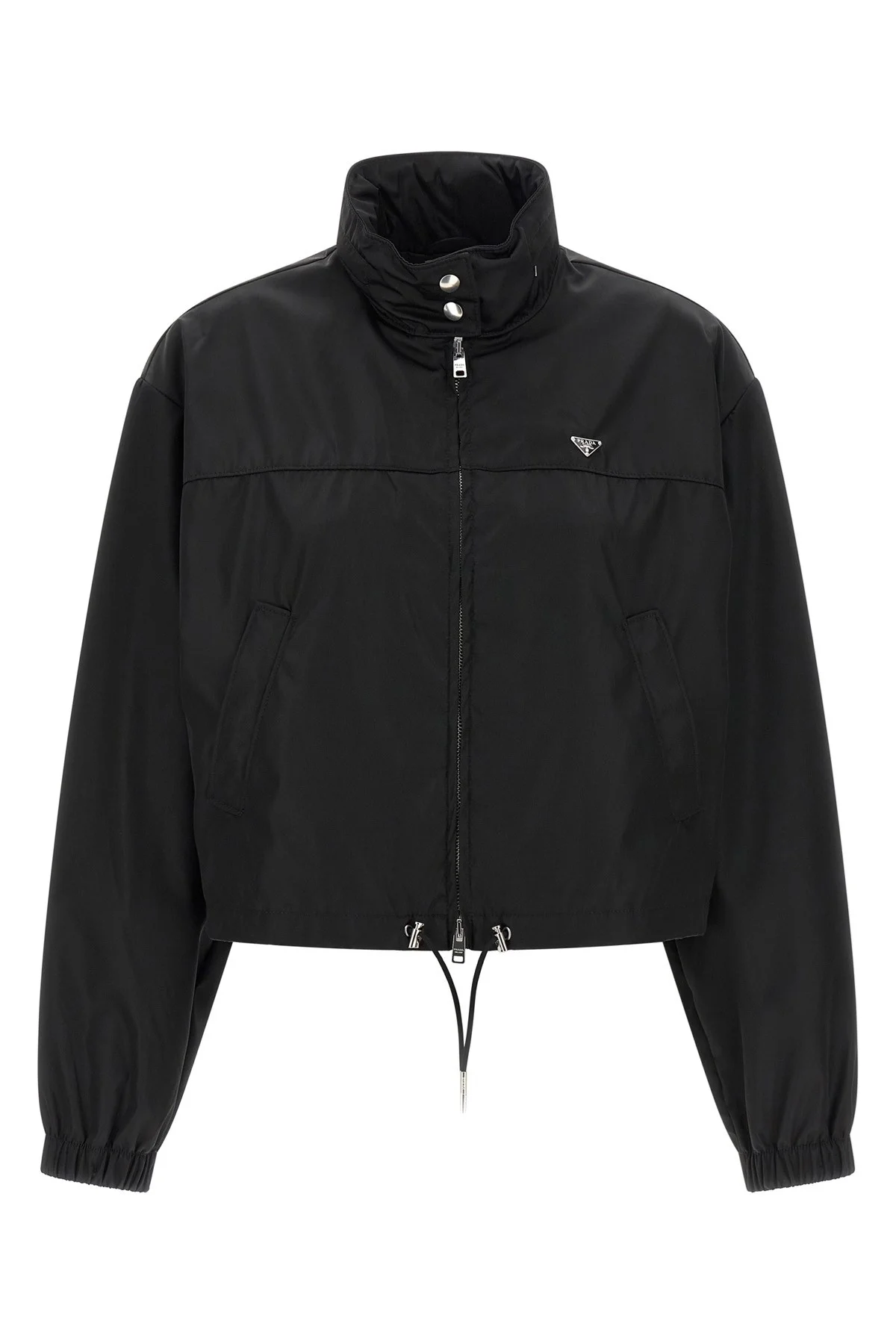 cod. 292351SOOO1WQ8F0002 Re-Nylon jacket, crop model, triangle logo in enamelled metal and front zip closure, standing collar with snap button closure and removable hood, pockets, long sleeves with elastic cuffs, drawstring on the hem, unlined. SUSTAINABLE: Product made with Re-Nylon, a regenerated yarn made from the recycling and purification of plastic collected in oceans, fishing nets and textile fibers Color: Black Size & Fit: true to size fit Composition: 100% polyamide Made in: Romania