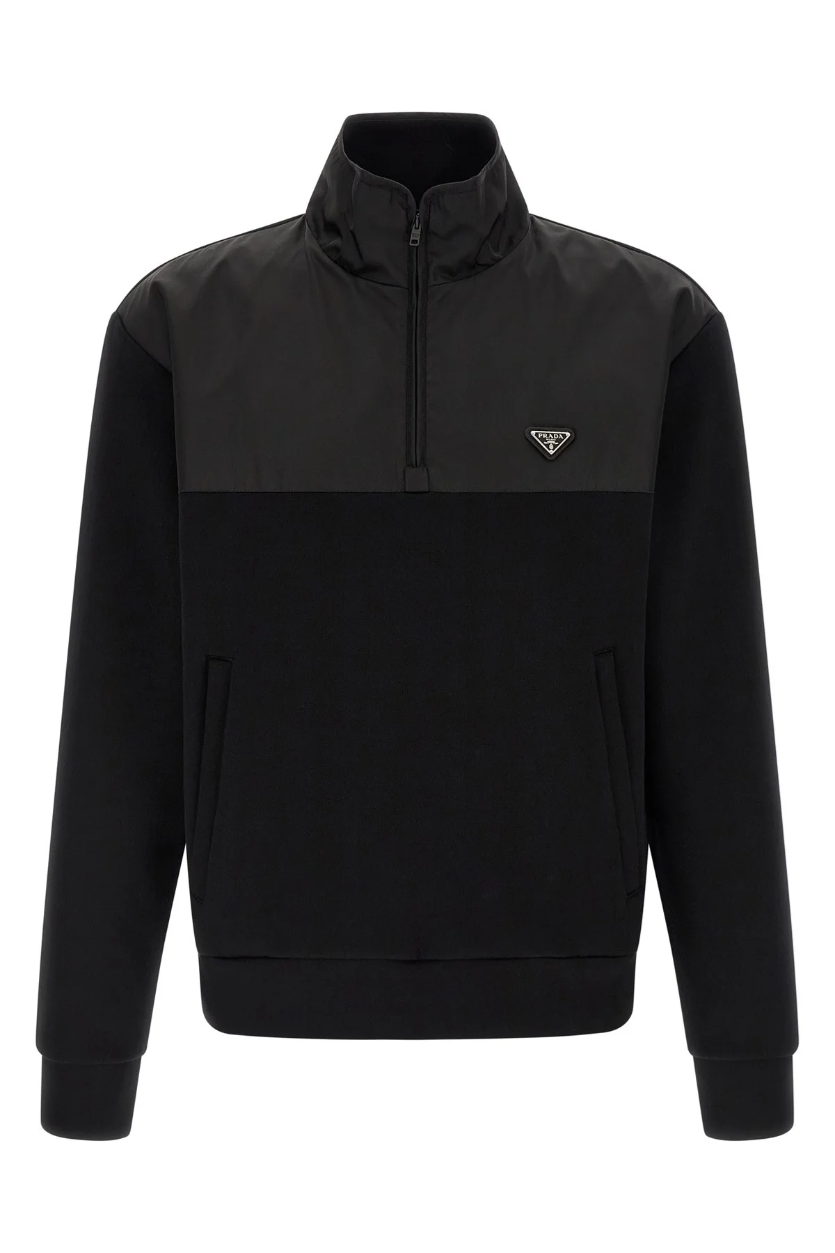 cod. UJL20DSOOO11JEF0806 Heavy cotton sweatshirt with tone-on-tone Re-Nylon details, front enameled metal triangle logo, high neck, half-zip, pockets, long cuffed sleeves, and headband. SUSTAINABLE: This product is made with Re-Nylon, a regenerated yarn made from recycled and purified plastic collected in oceans, fishery nets and textile fibers. Color: Black Size & Fit: true to size fit Composition: 70% cotton 30% polyamide Made in: Italy