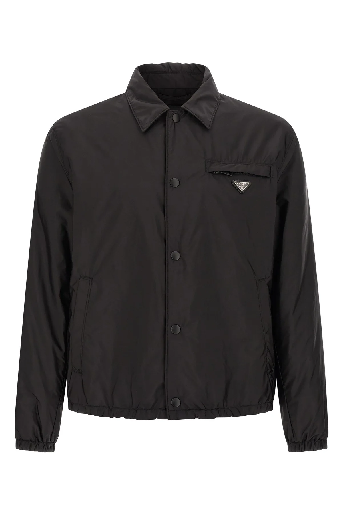 cod. SGB737SOOO1WQ9F0002 Lightly padded Re-Nylon feather jacket, pocket with triangle logo in enamelled metal, shirt collar, front snap button closure, long sleeves with elastic cuffs, drawstring on the hem. SUSTAINABLE: Product made with Re-Nylon, a regenerated yarn made from the recycling and purification of plastic collected in oceans, fishing nets and textile fibers Color: Black Size & Fit: true to size fit Composition: 100% recycled polyamide Made in: Italy PROMO CODE NOT APPLICABLE