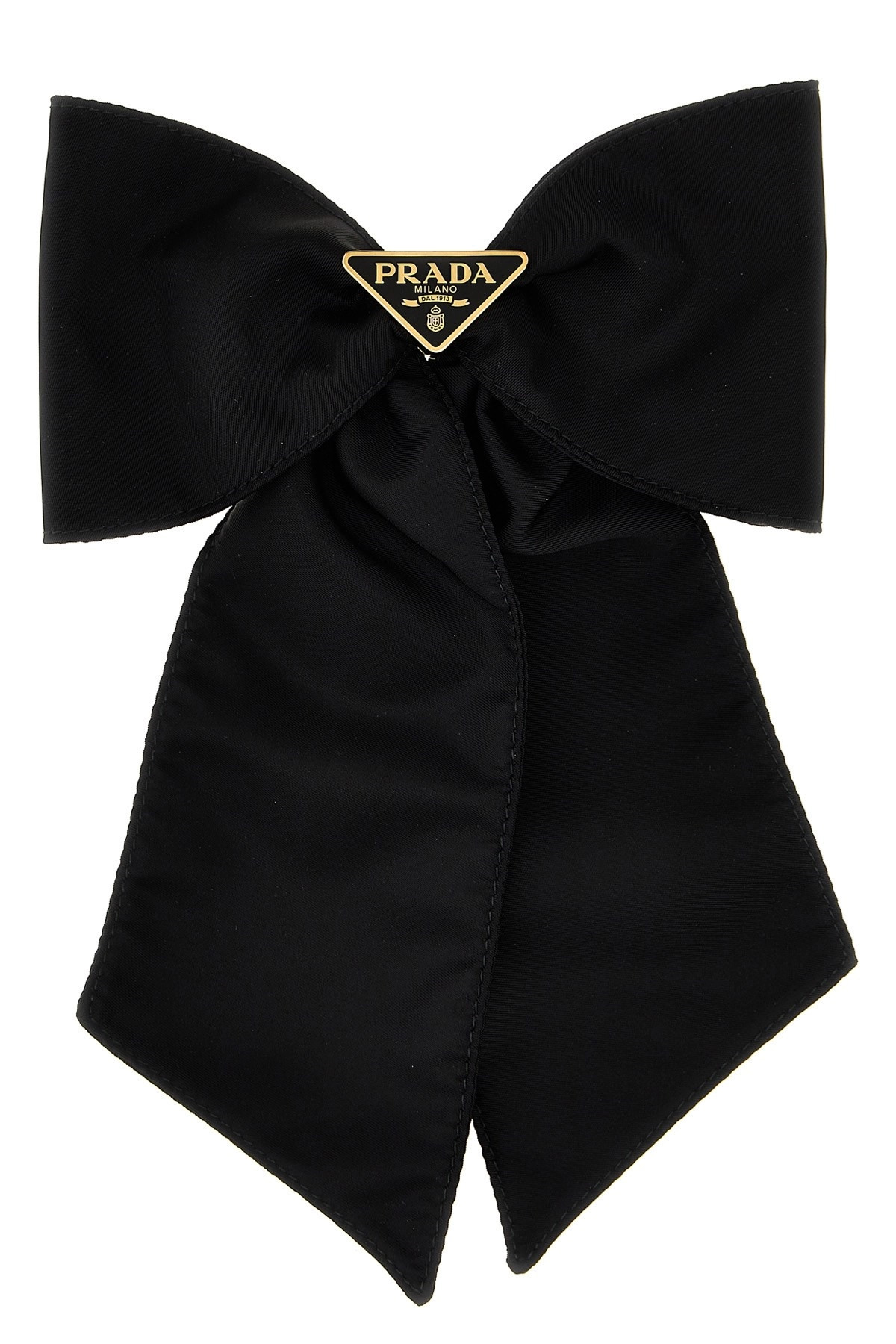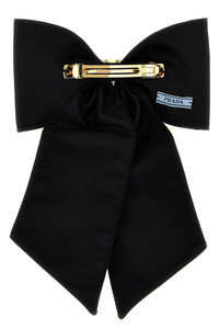 cod. 1IF1632DMIF0632 Re-Nylon bow hair clip, triangle logo application in enamelled metal. SUSTAINABLE: This product is made with Re-Nylon, a regenerated yarn made from recycled and purified plastic collected in oceans, fishery nets and textile fibers. Color: Black Composition: 100% brass Made in: Italy