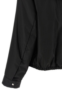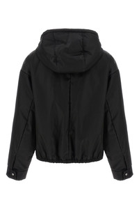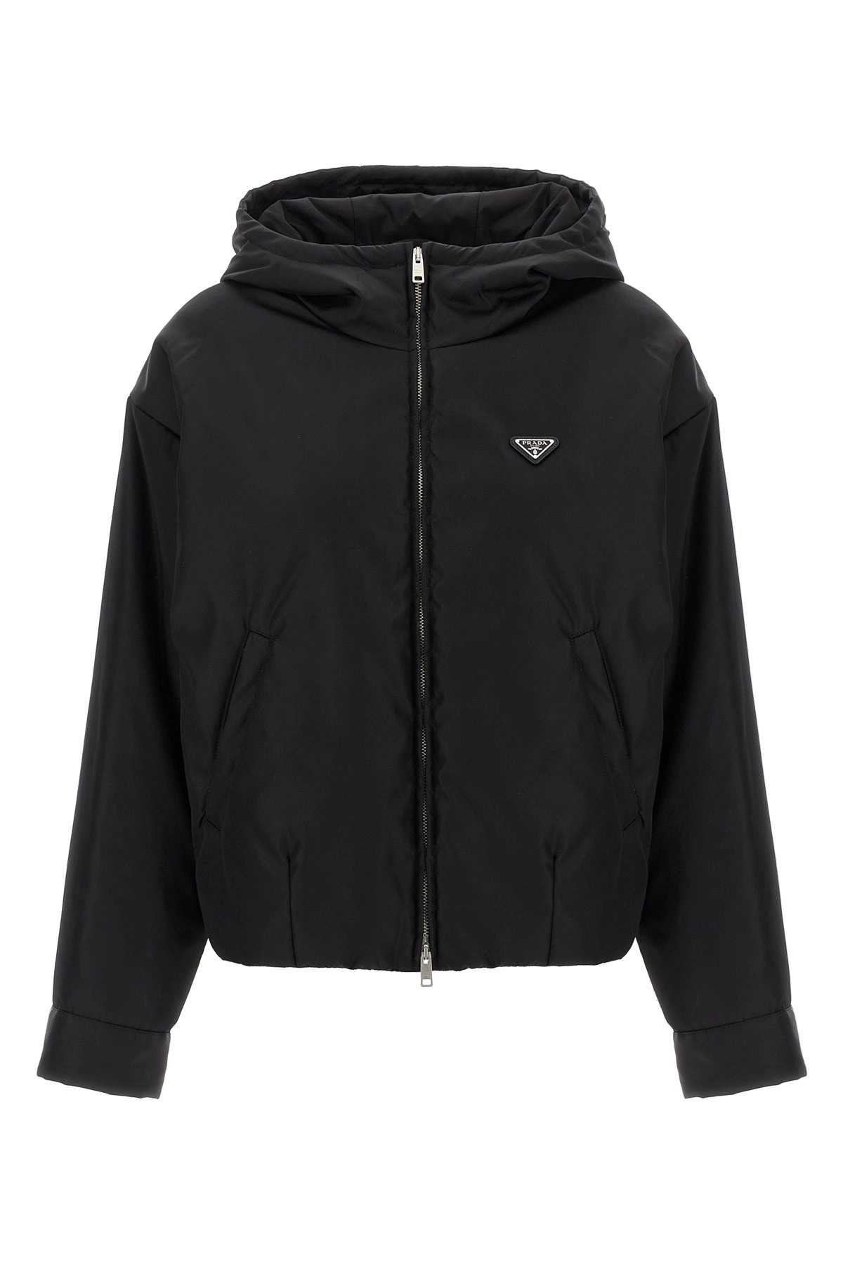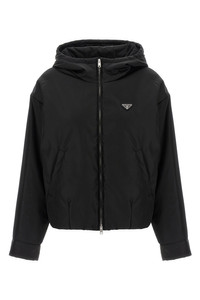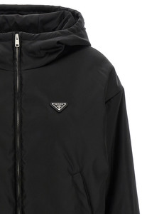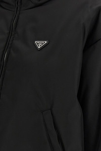 cod. 29P246SVMO1WQ8F0002 Re-Nylon hooded jacket, triangle logo in enamelled metal and front zip closure, pockets, long sleeves with cuffs, elastic on the hem. SUSTAINABLE: This product is made with Re-Nylon, a regenerated yarn made from recycled and purified plastic collected in oceans, fishery nets and textile fibers. Color: Black Size & Fit: true to size fit Composition: 100% polyamide Made in: Italy PROMO CODE NOT APPLICABLE