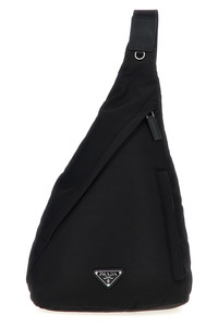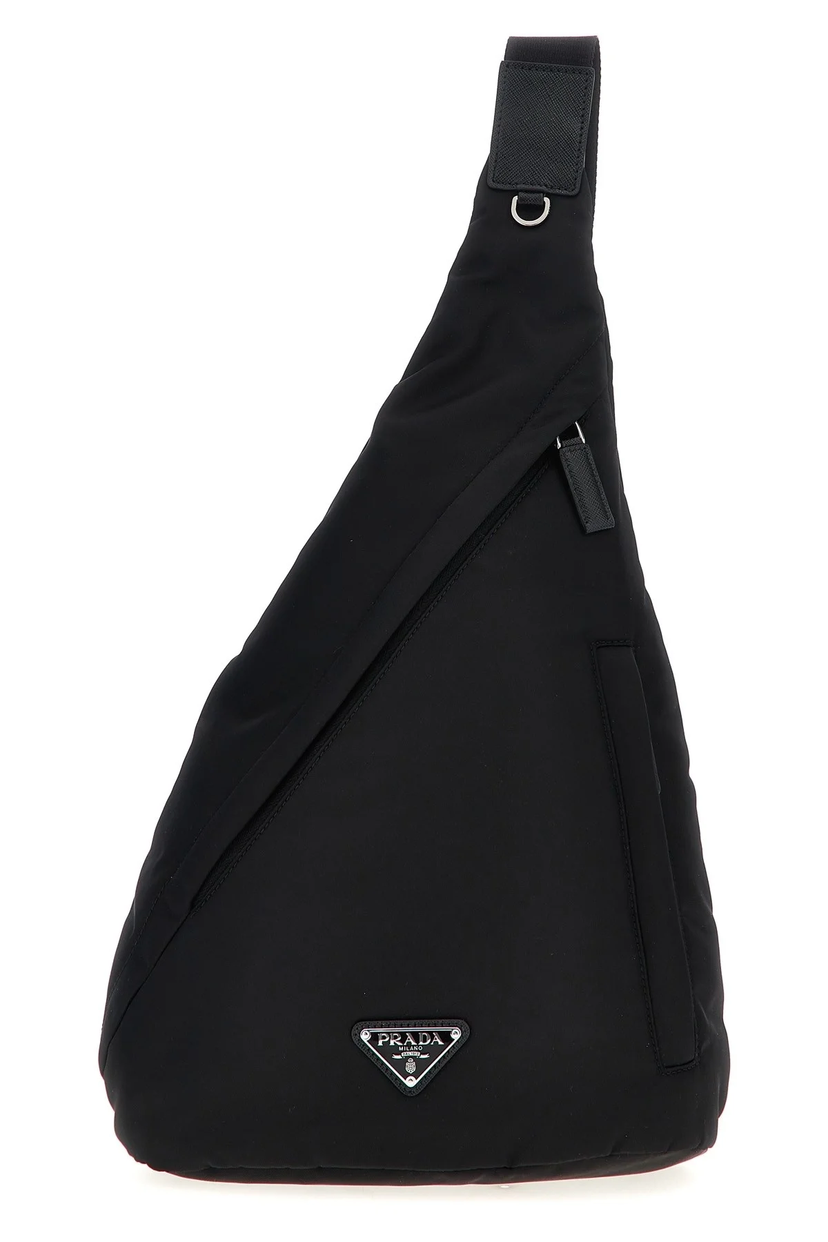 cod. 2VZ092VOMO2DMGF0002 One-shoulder backpack in re-nylon fabric, adjustable shoulder strap and buckle with snap system, front enameled metal triangle logo, zip closure, pockets, ring for trick attachment. SUSTAINABLE: This product is made with Re-Nylon, a regenerated yarn made from recycled and purified plastic collected in oceans, fishery nets and textile fibers. Color: Black Size & Fit: W 26.5 x H 37.5 x D 10 cm Composition: 100% polyamide Made in: Italy