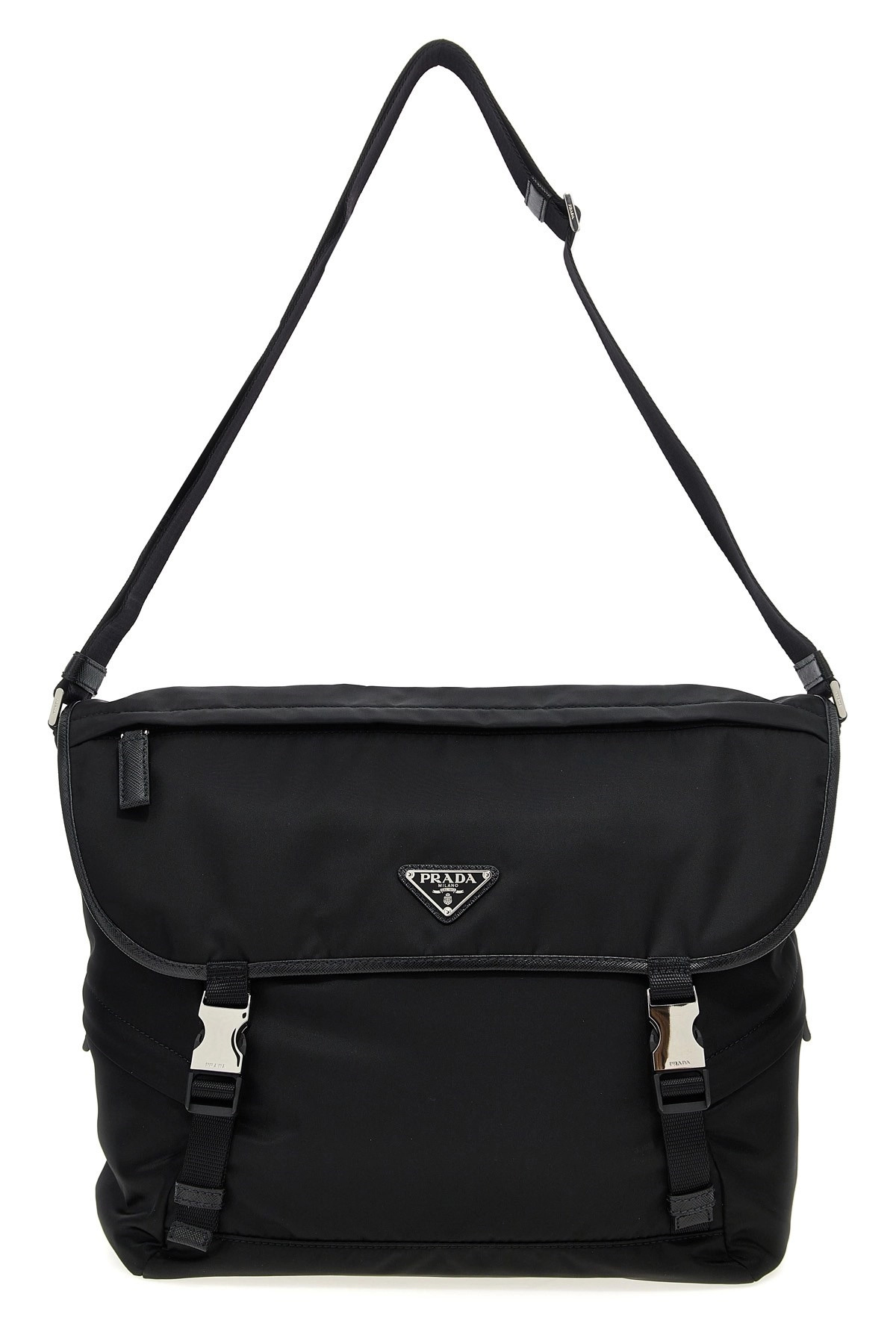 cod. 2VD052VKOH2DMGF0002 Re-Nylon shoulder strap with Saffiano leather details, flap closure with buckles, triangle metal enamel logo applique, and adjustable shoulder strap. SUSTAINABLE: This product is made with Re-Nylon, a regenerated yarn made from recycled and purified plastic collected in oceans, fishery nets and textile fibers. Color: Black Size & Fit: W 30 x H 27.5 x D 14.5 cm Composition: 100% polyamide Made in: Italy