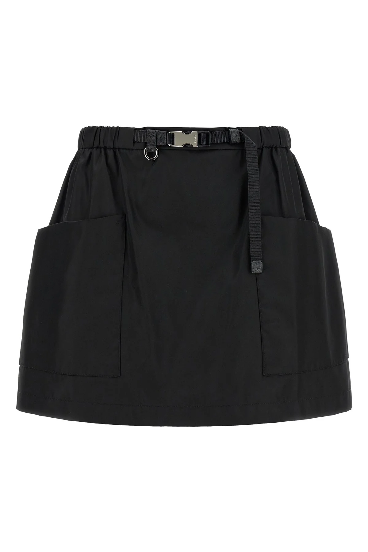 cod. 21H028SOOO1WQ8F0002 Re-Nylon mini skirt, ribbon belt with tuc closure and Saffiano leather details, pockets, triangle logo in tone-on-tone fabric on the back, unlined. SUSTAINABLE: This product is made with Re-Nylon, a regenerated yarn made from recycled and purified plastic collected in oceans, fishery nets and textile fibers. Color: Black Size & Fit: true to size fit Composition: 100% polyamide Made in: Romania