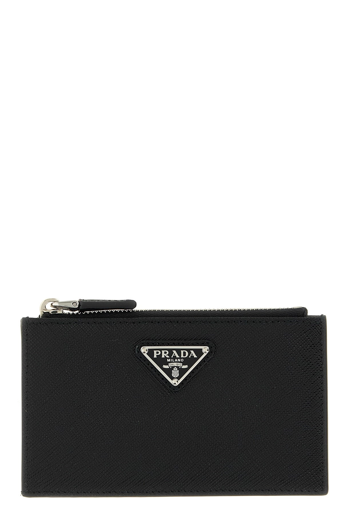 cod. 2MC086QHHF0002 Saffiano leather card holder, zip pocket and triangle logo in enameled metal on the front. Color: Black Size & Fit: W 13.5 x H 8 x D 1 cm Composition: 100% calfskin leather (Bos Taurus) Made in: Italy PROMO CODE NOT APPLICABLE
