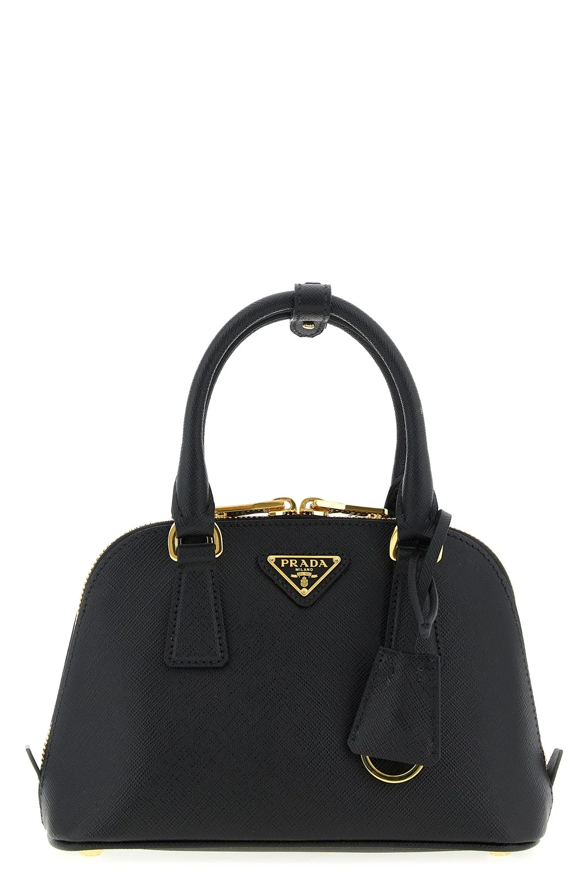 cod. 1BA851VEOONZVF0002 Saffiano leather handbag with front enameled metal triangle logo, double fixed tubular handle, top zip closure, rigid base with metal feet, removable keyring, adjustable and removable shoulder strap. Color: Black Size & Fit: W 21 x H 14 x D 9 cm Composition: 100% calfskin leather (Bos Taurus) Made in: Italy PROMO CODE NOT APPLICABLE