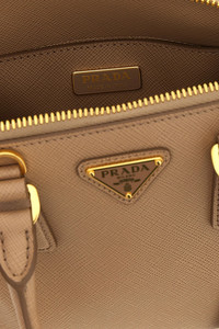 cod. 1BA851VEOONZVF0770 Lux saffiano leather handbag with fixed leather handles, adjustable and removable leather shoulder strap, zip closure, front logo. Color: Beige Size & Fit: L25 x H18.5 x W12.5 cm Composition: 100% calfskin leather (Bos Taurus) Made in: Italy