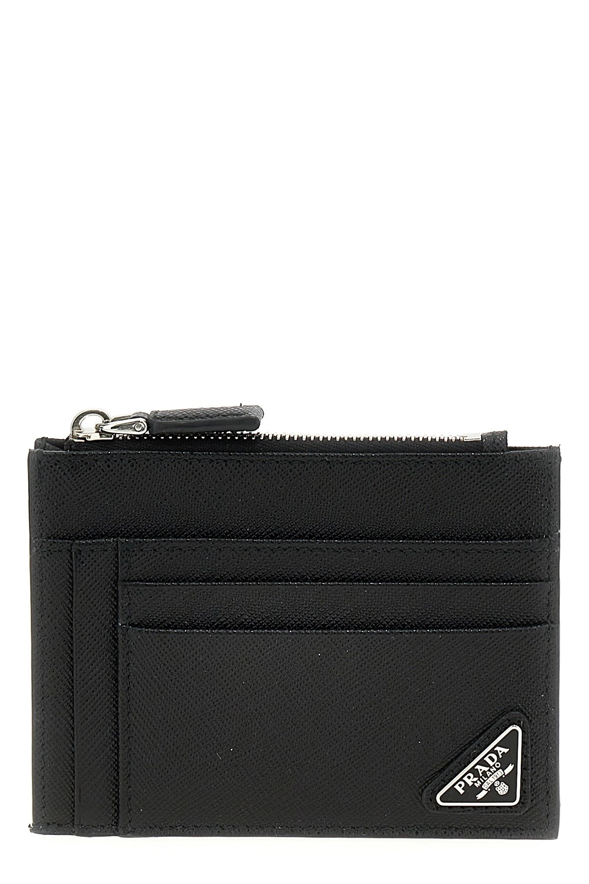 cod. 2MC067QHHF0002 Saffiano leather card holder with triangle enameled metal logo, zip closure, slots for external cards. Color: Black Size & Fit: W 12 x H 9 cm Composition: 100% bos taurus Made in: Italy