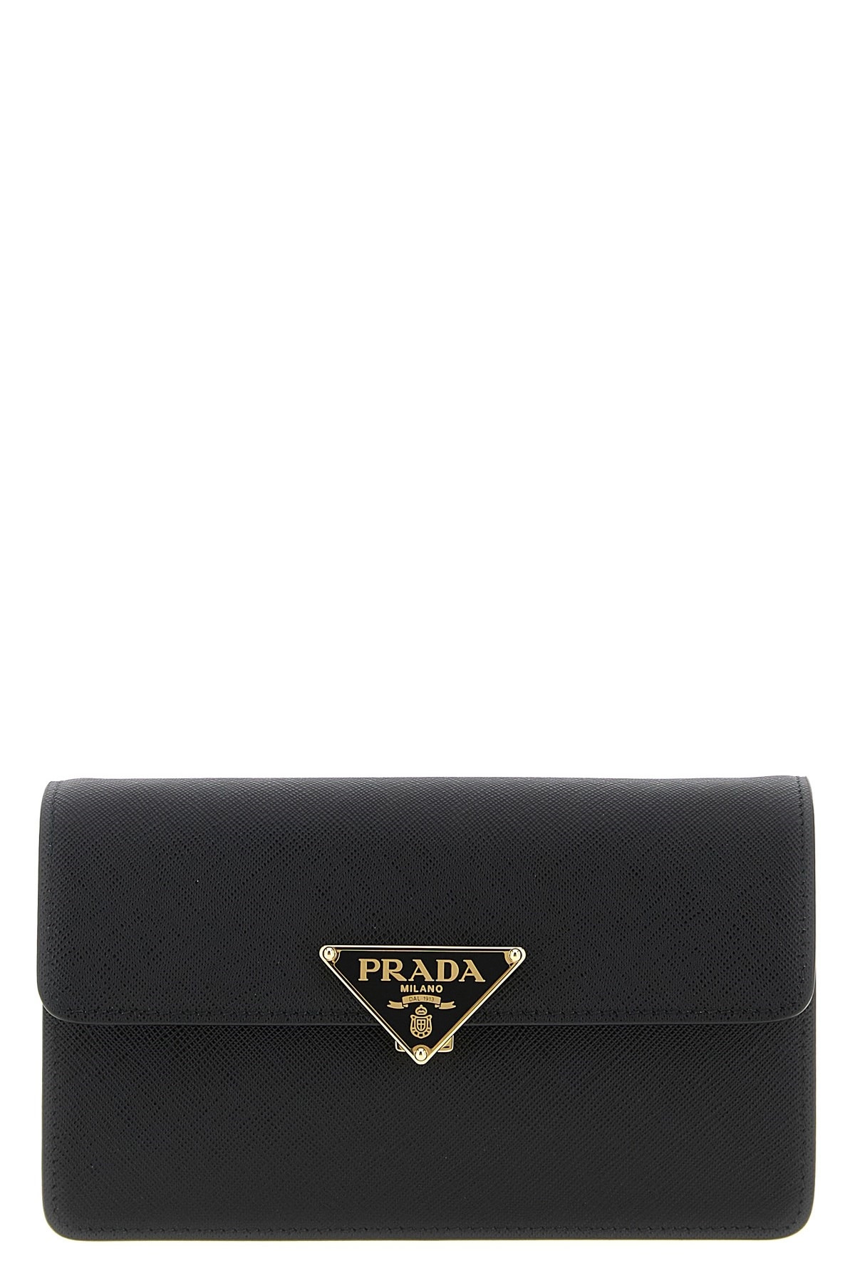 cod. 1BD386VOTONZVF0002 Saffiano leather mini crossbody bag, flap closure with triangle logo in flap enamelled metal, adjustable shoulder strap. Color: Black Size & Fit: W 19.5 x H 11.5 x D 5 cm Composition: 100% calfskin leather (Bos Taurus) Made in: Italy