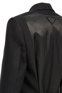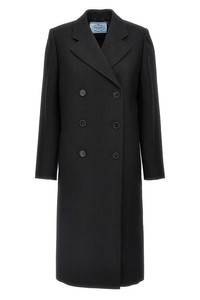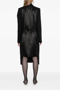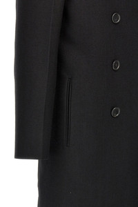 cod. P601SSOOO15UWF0002 Double-breasted wool coat, satin back insert with adjustable strap, button closure, pockets, long sleeves, back vent. Color: Black Size & Fit: true to size fit Composition: 100% virgin wool Made in: Italy