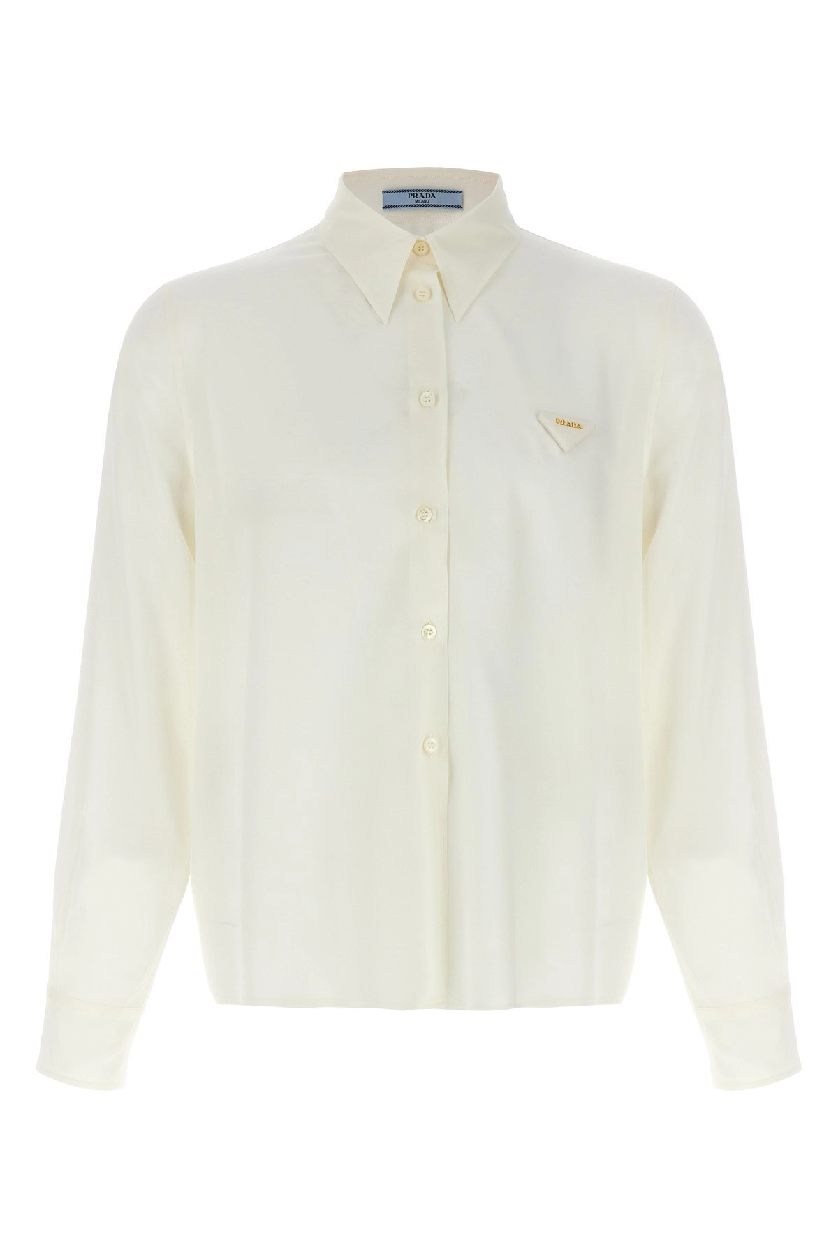 cod. P473FSOOO14KGF0304 Silk shirt, fabric and metal front triangle logo, long sleeve with cuff, button closure. Color: White Size & Fit: true to size fit Composition: 100% silk Made in: Italy