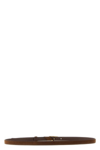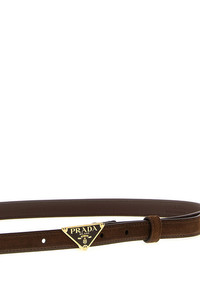 cod. 1CC621054F0324 Suede belt, triangle logo buckle in enameled metal. Color: Brown Size & Fit: H 1.5 cm Composition: 100% calfskin leather (Bos Taurus) Made in: Italy