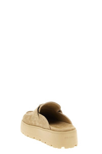cod. 1XZ778F045054F0379 Suede sabots, triangle logo in enameled metal on the front, oversized rubber sole, tread with gusset design. Color: Beige Composition: 100% calfskin leather (Bos Taurus) Size&Fit: EU WOMAN - Heels: 4.5 cm