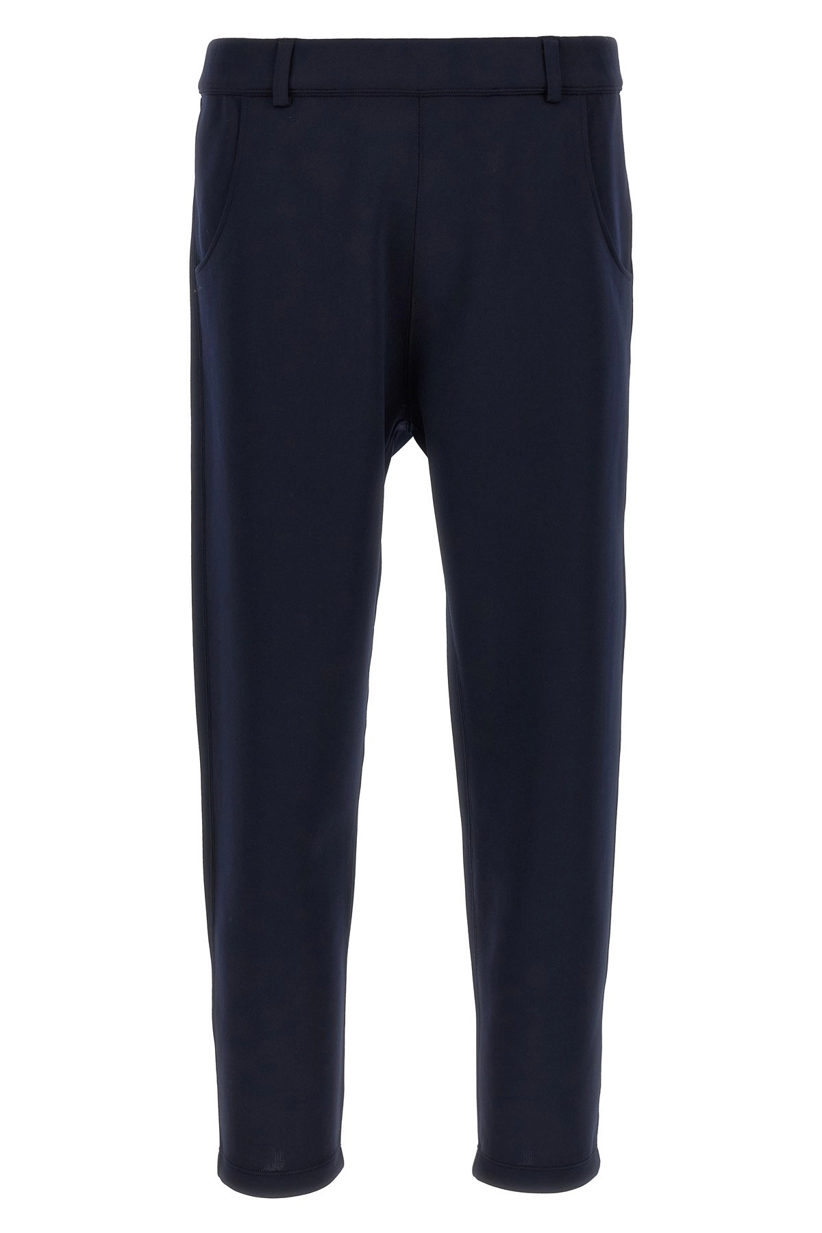 cod. UJP255SOOO1TQXF0008 Techno jersey trousers, tone-on-tone fabric triangle logo on the back, elastic waistband, straight leg, pockets. Color: Blue Size & Fit: true to size fit Composition: 98% polyester, 2% elastane Made in: Italy
