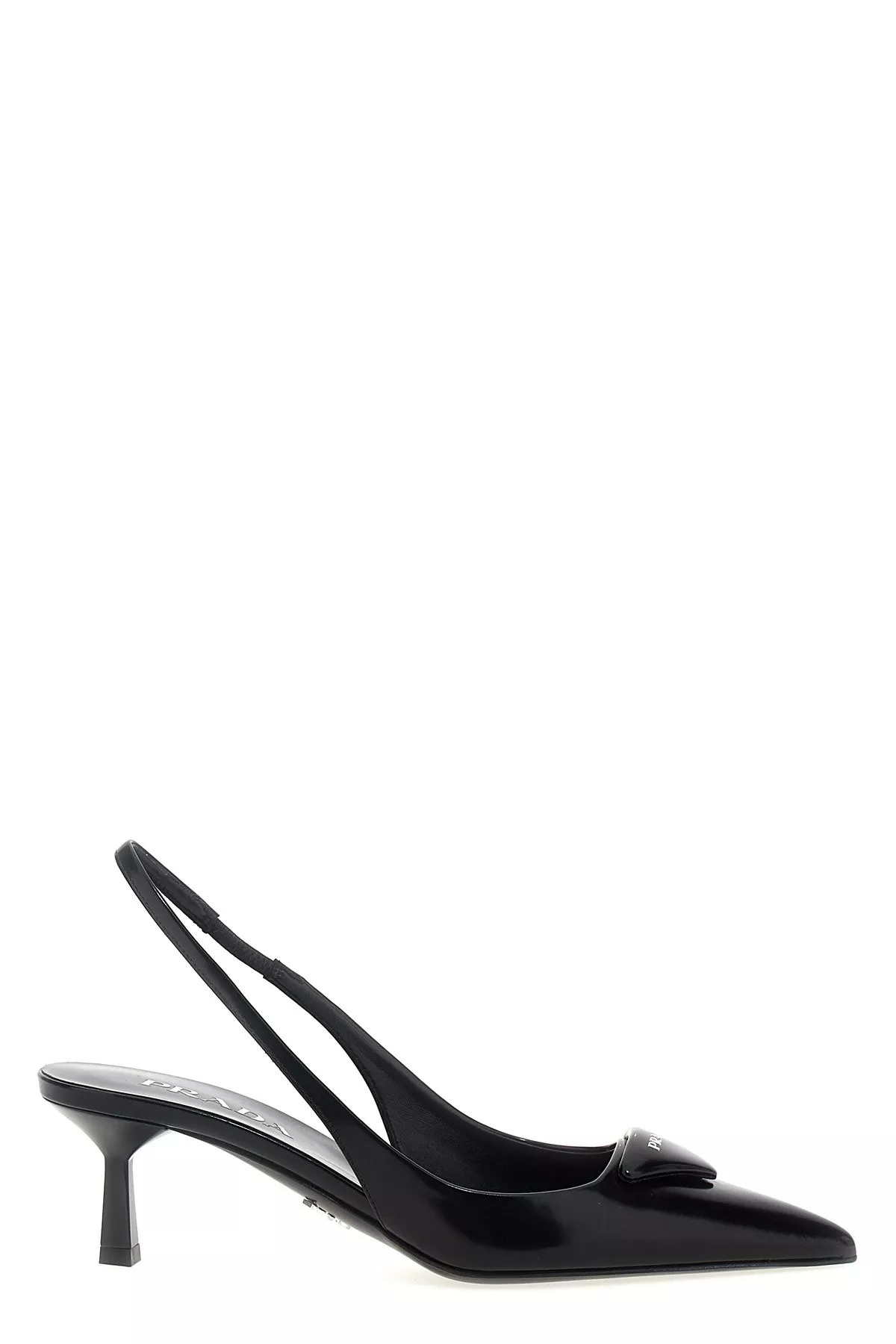 cod. 1I901MFDD55055F0002 Leather slingbacks with triangle leather logo application on the front, elastic strap, sculptural heel. Color: Black Size & Fit: EU WOMEN Heel: 5.5 cm Composition: 100% cow leather (Bos Taurus) Made in: Italy PROMO CODE NOT APPLICABLE