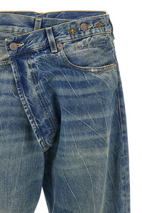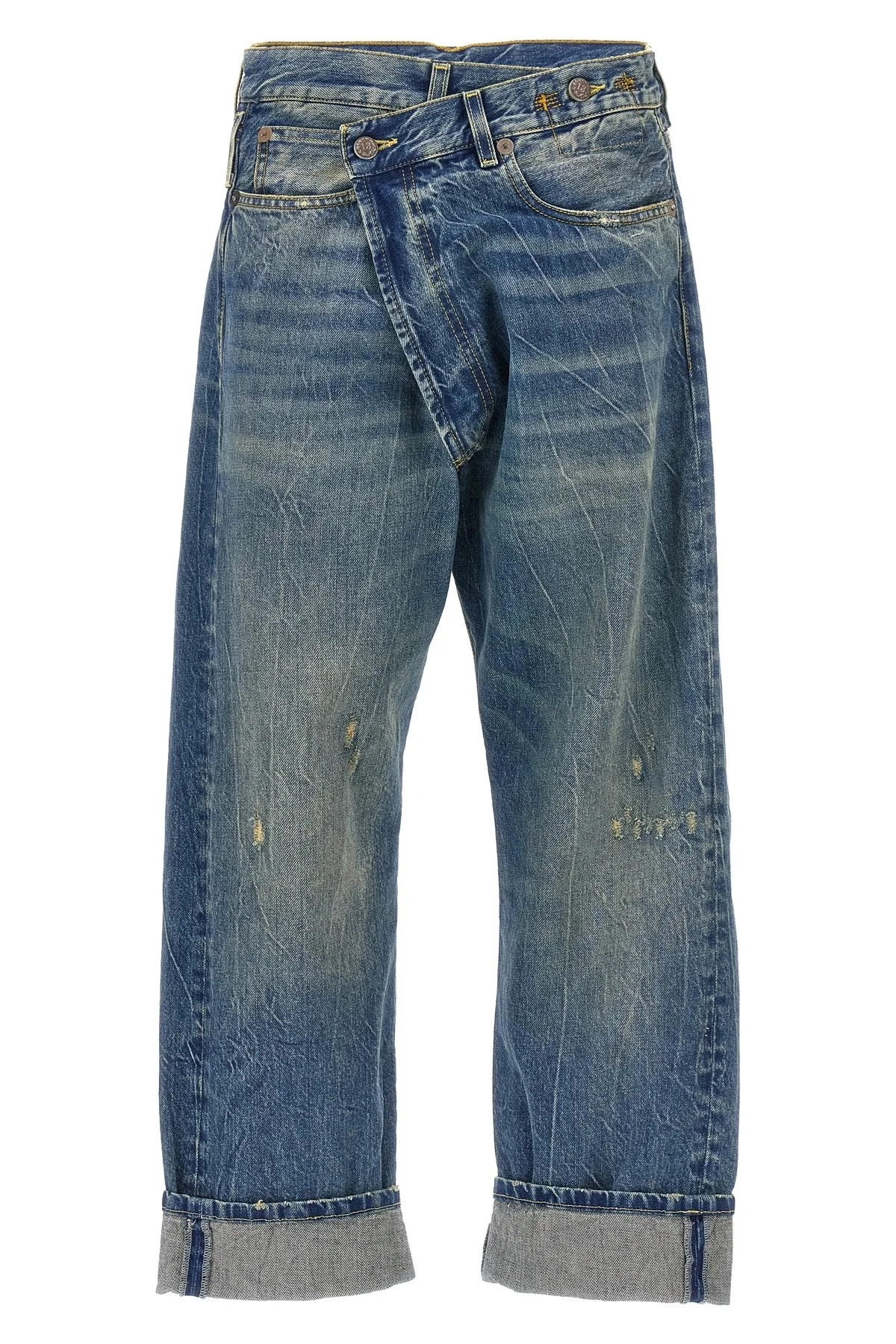 cod. R13W2048734KELLY 'Cross Over' cotton denim jeans with used-effect details, asymmetric wallet closure with buttons, five pockets, leather logo tag, turned-up hem. Color: Blue Size & Fit: true to size fit Composition: 100% cotton Made in: Italy