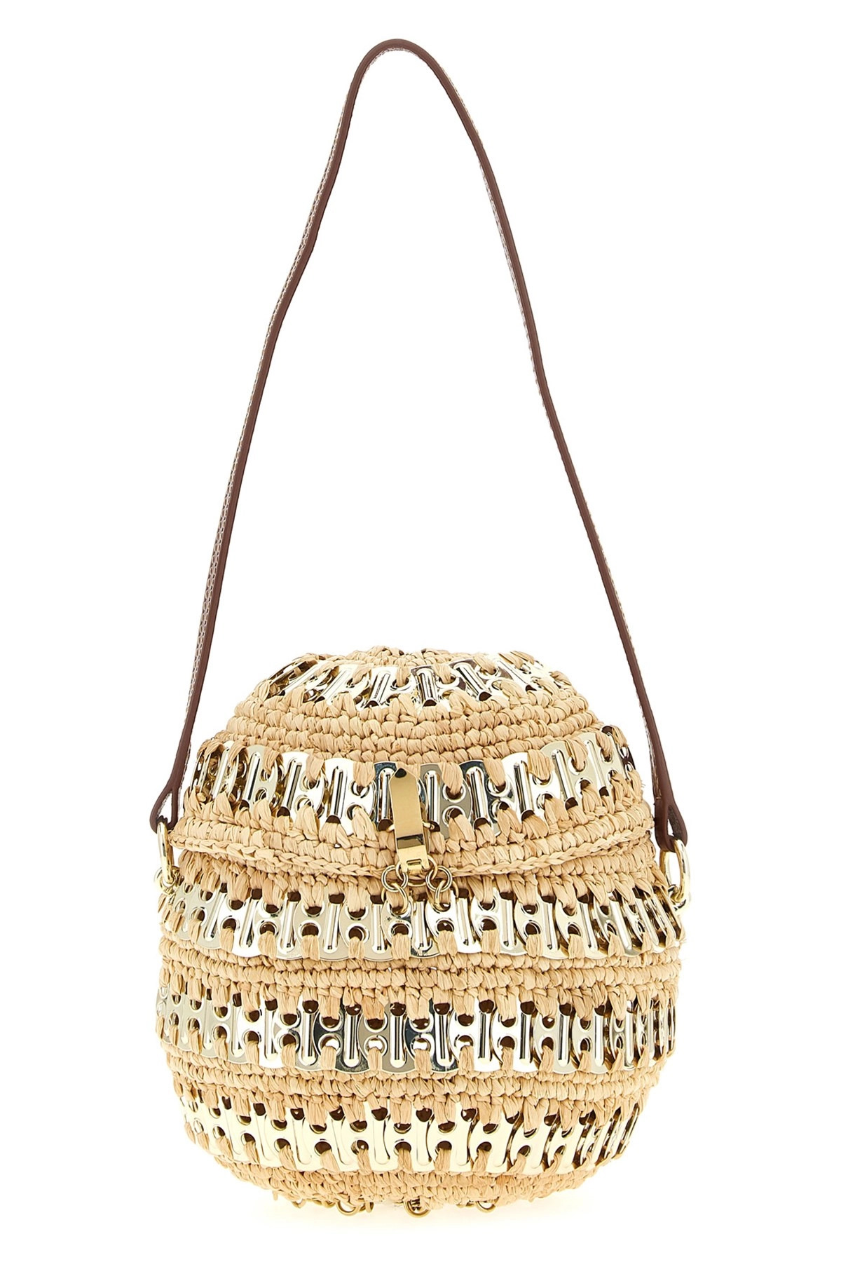 cod. 25ASS0474NAT060M227 '1969 Ball' handbag in woven raffia with metal discs, top shell with hook closure, leather handle. Handcrafted product, any imperfections are to be considered characteristics of uniqueness. Color: Beige Size & Fit: ⌀ 13,5 cm Composition: 60% raffia 30% calfleather 10% brass Made in: Madagascar