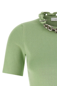 cod. 26PMPU016ML0308P316 Micro ribbed stretch cotton T-shirt, crew neck with metal and fabric chain detail, short sleeves. Color: Green Size & Fit: true to size fit Composition: 44% so 36% cotton 20% elastane Made in: China