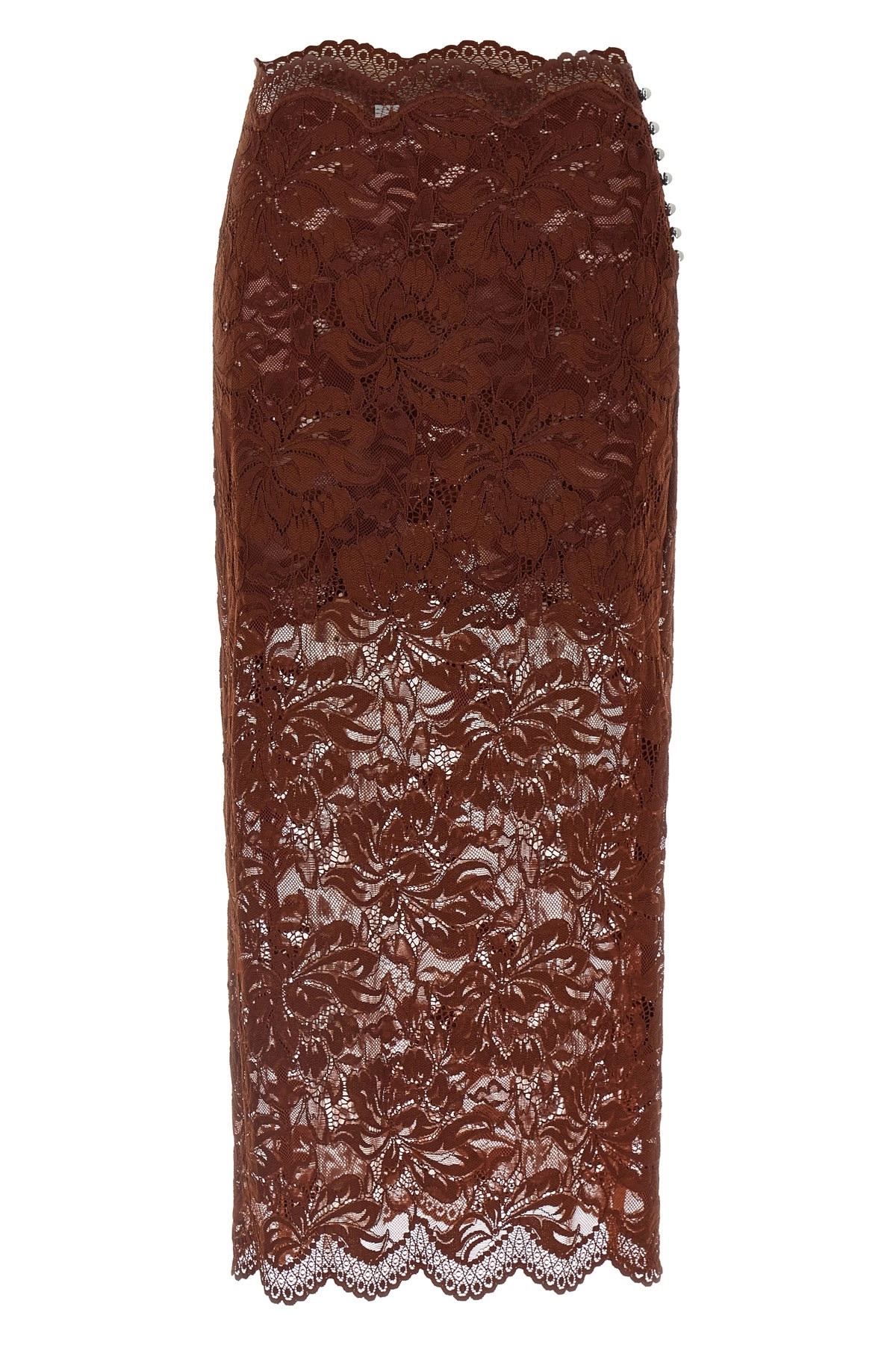cod. 25HJJU598PA0170P237 Stretch lace midi skirt, side button closure, asymmetric hem, lining. Color: Brown Size & Fit: true to size fit - FRENCH size Composition: 90% polyamide, 10% elastane Made in: Tunisia