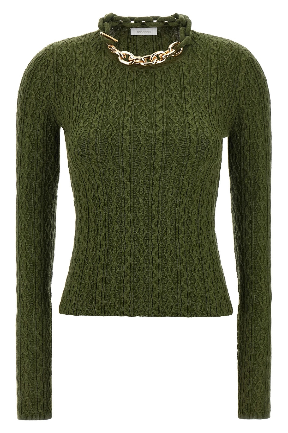 cod. 25AMPU049ML0320P303 Ribbed wool and cashmere blend sweater, crew neck with metal necklace detail, long sleeves. Color: Green Size & Fit: true to size fit Composition: 90% wool, 10% cashmere Made in: China