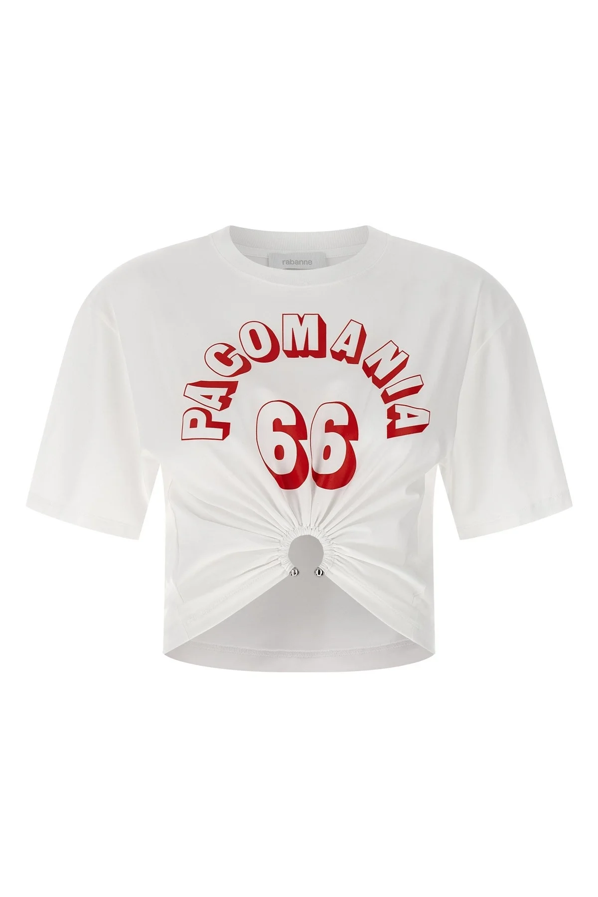 cod. 26PJTE030CO0555P100 Cotton t-shirt, print and front metal piercing that creates drapes, crop model, crew neck, short sleeves, asymmetrical hem. Color: White Size & Fit: true to size fit Composition: 91% cotton, 9% elastane Made in: Portugal