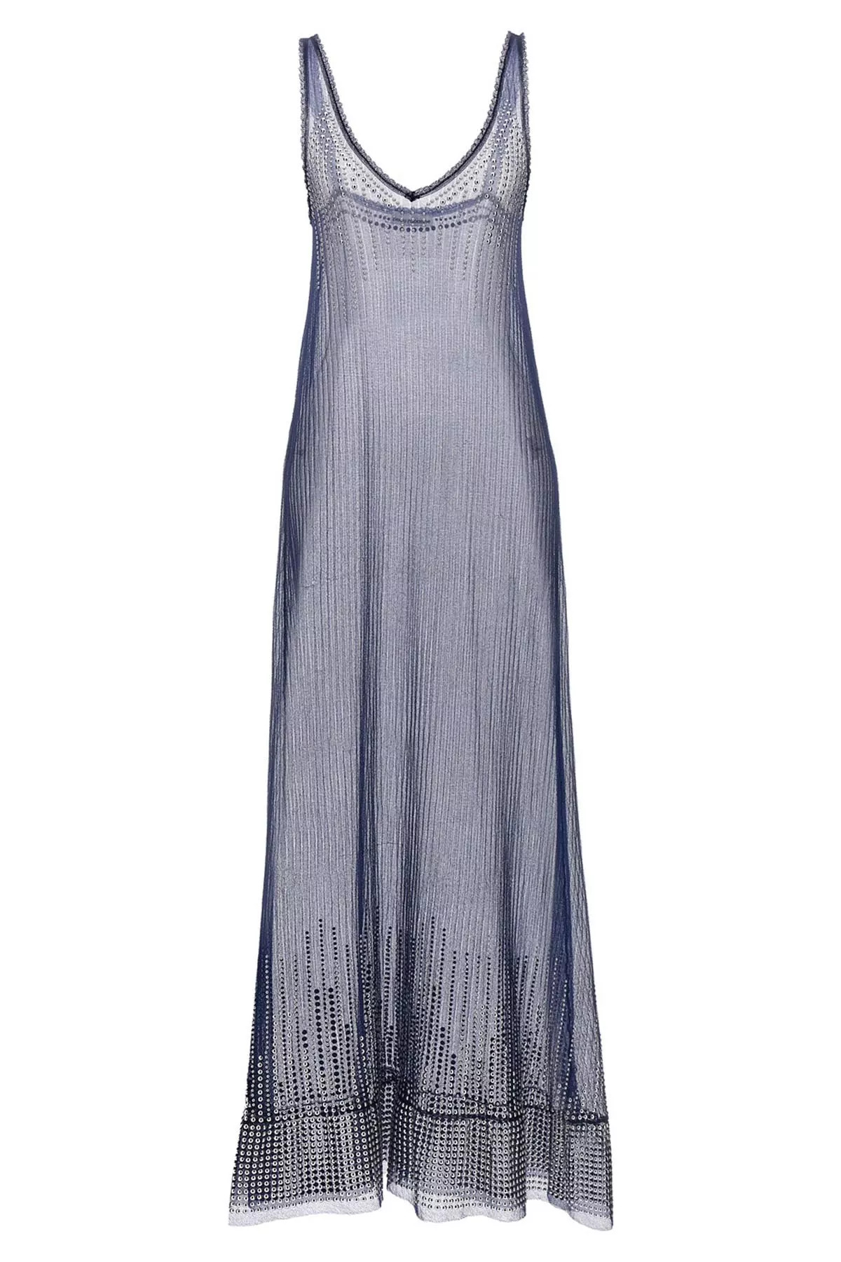cod. 23PMRO534ML0217P410 Transparent mesh fabric dress, with stud appliqués, thin straps, and a V-neck Color: Blue Material: 70% polyamide 30% polyester Made in: FrancE Size &Fit: True to size fit