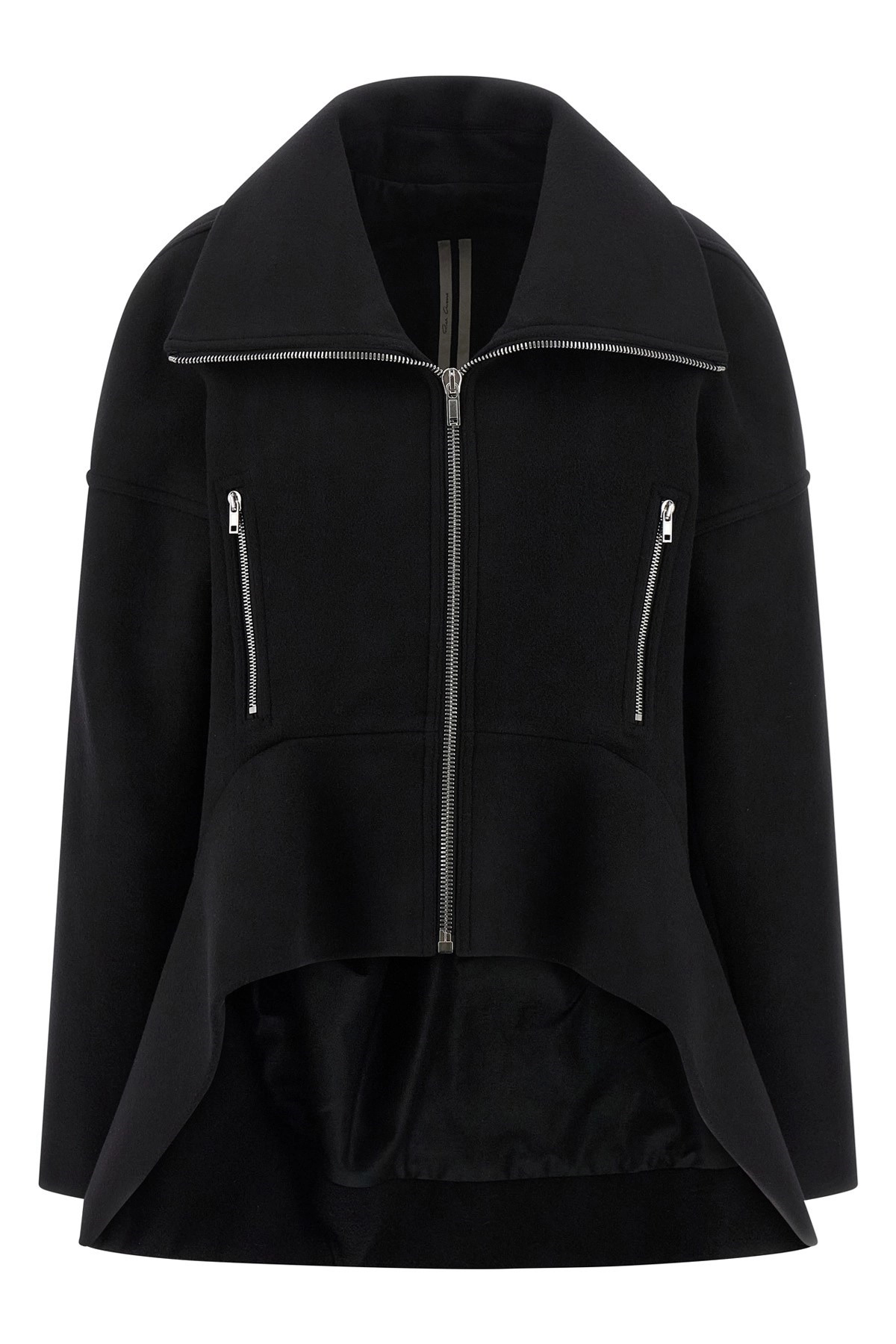 cod. RO02E4752WSF09 Draculimo' virgin wool cloth coat with foldable reinforced high neck, front zip closure, pockets, long sleeves with dropped shoulders, asymmetrical hem with slightly raised curved front hem. Color: Black Size & Fit: Comfort fit Composition: 100% virgin wool Made in: Italy