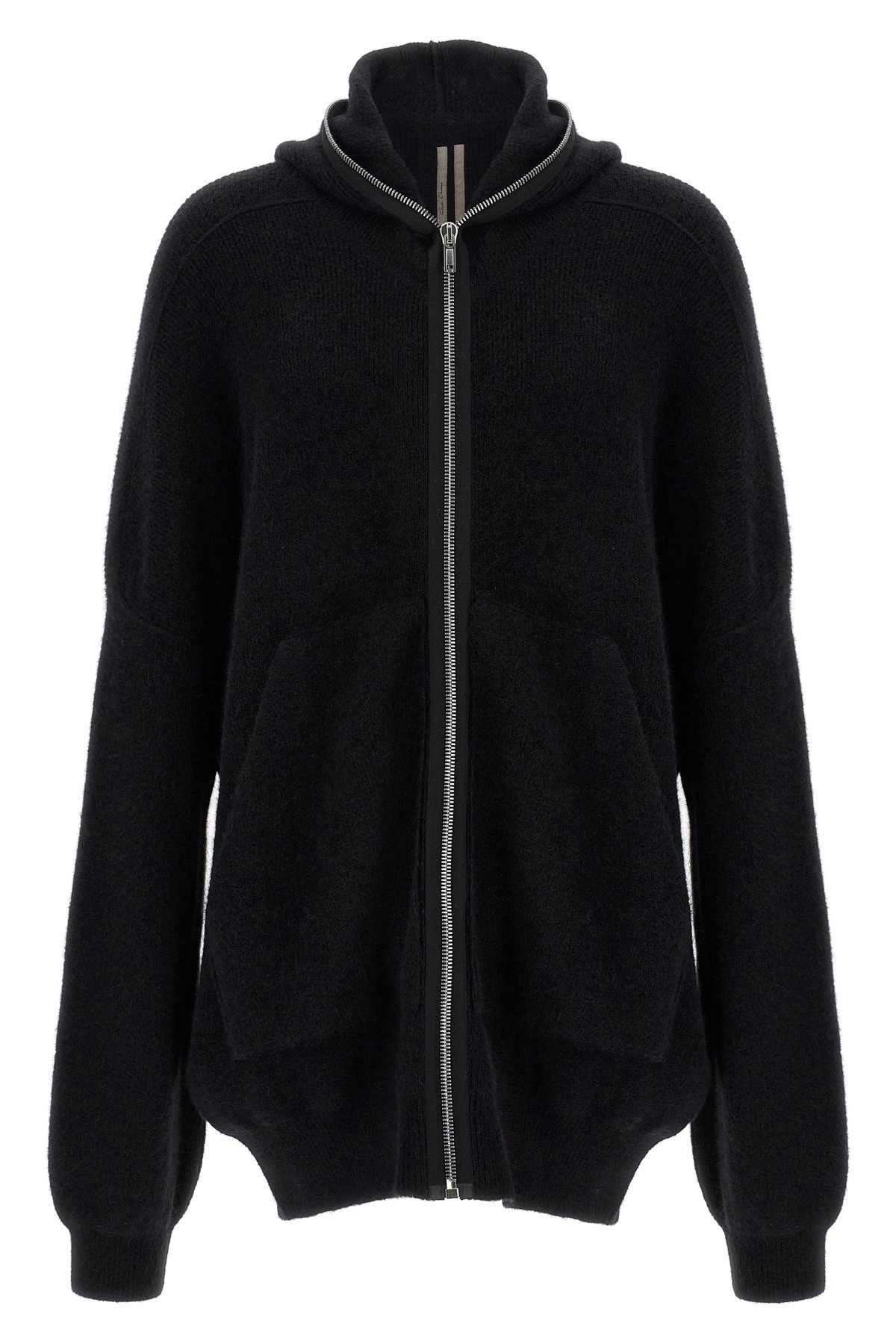 cod. RU02E1688KWP09 Alpaca wool blend cardigan, hood, front zip closure, pockets, long sleeves with cuffs and dropped shoulders. Color: Black Size & Fit: oversized fit Composition: 48% alpaca wool 30% polyamide 20% wool 2% elastane Made in: Italy