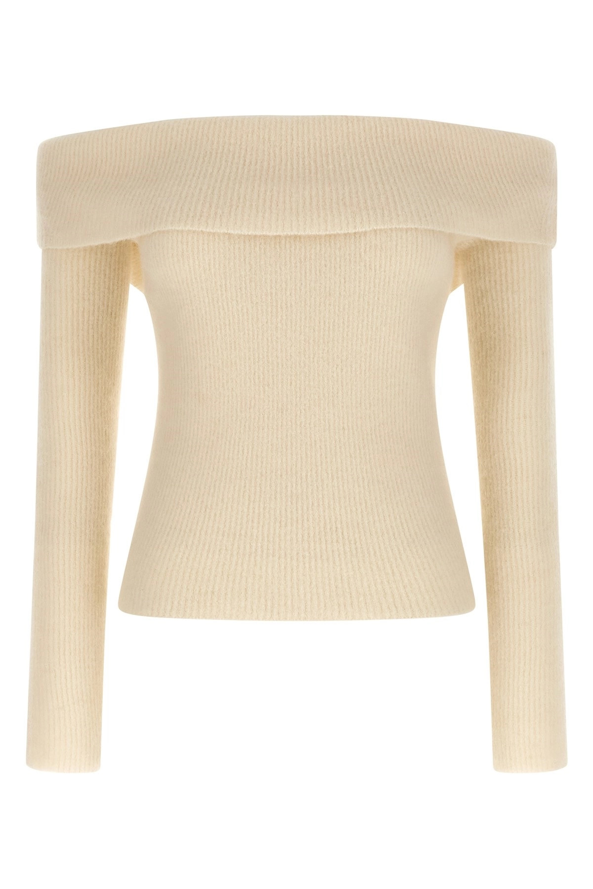 cod. RO02E4675KWP11 'Ls Cowl' ribbed wool sweater off-the-shoulder style with turned-up top, long sleeves. Color: White Size & Fit: true to size fit Composition: 100% wool Made in: Italy