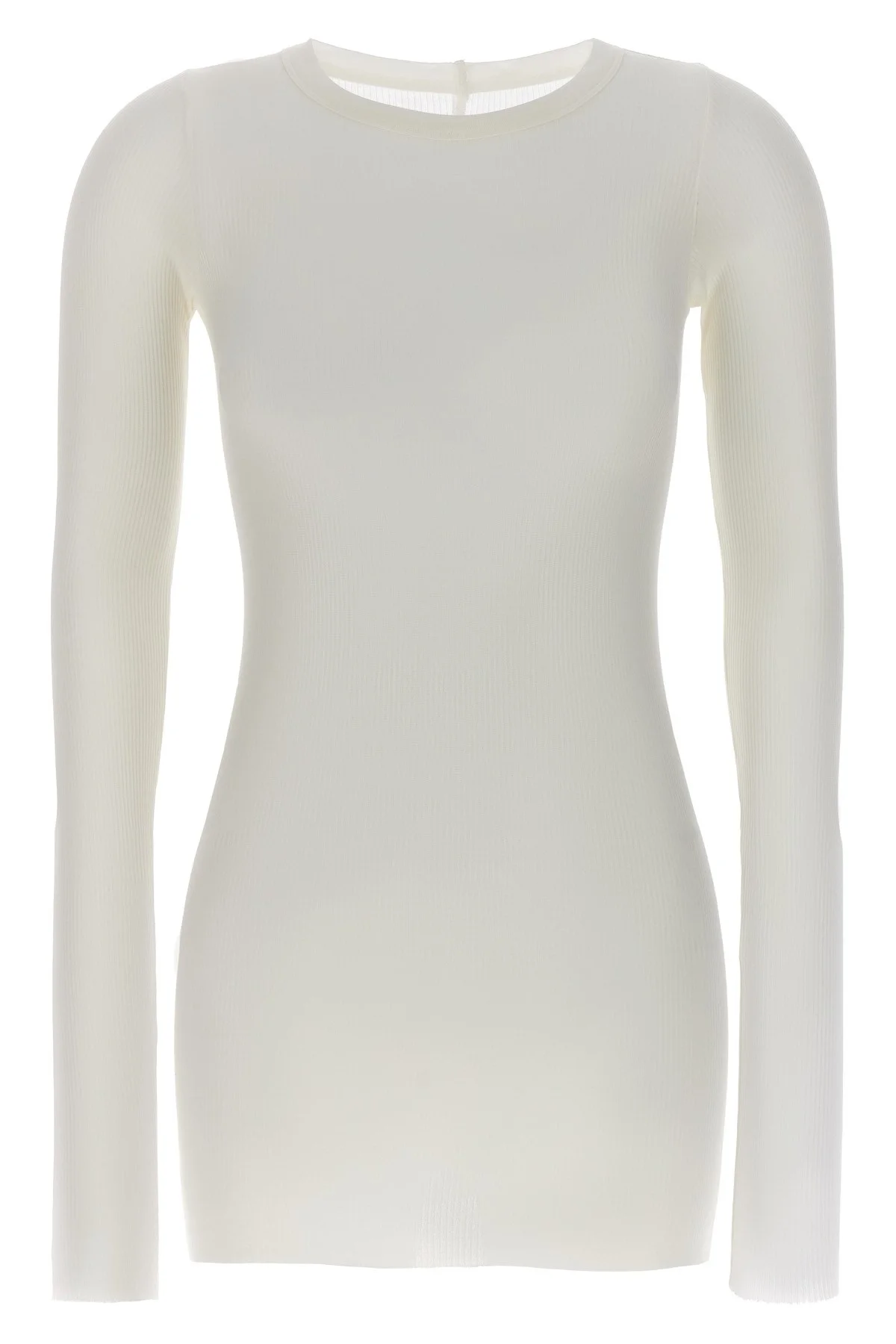 cod. RP01F6202RC11 'Rib LS T' ribbed viscose and stretch silk blend t-shirt, raw cut hem, crew neck, long sleeves. Color: White Size & Fit: Slim fit Composition: 88% viscose, 12% silk Made in: Italy