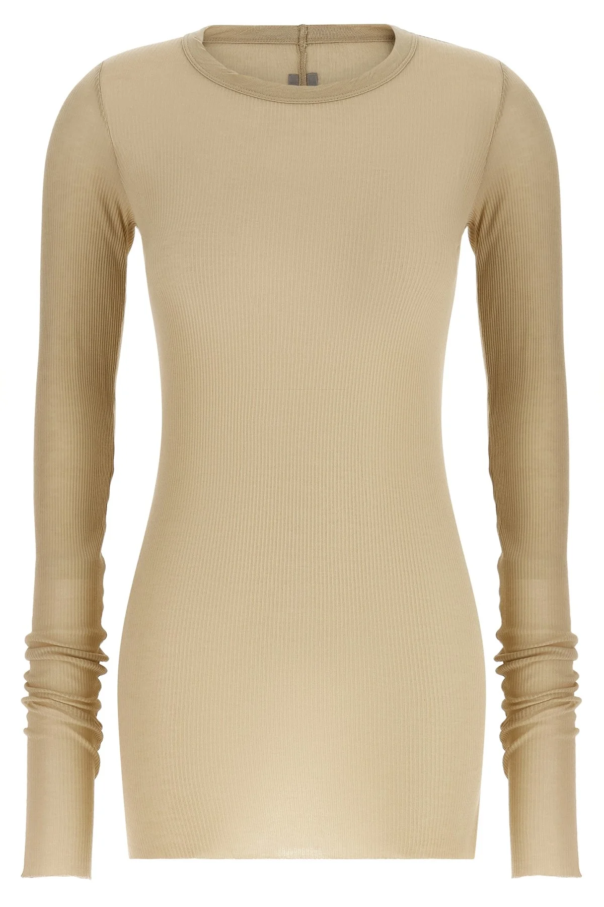 cod. RP01F6202RC138 'Rib LS T' ribbed viscose and stretch silk blend t-shirt, raw cut hem, crew neck, long sleeves. Color: Beige Size & Fit: Slim fit Composition: 88% viscose, 12% silk Made in: Italy
