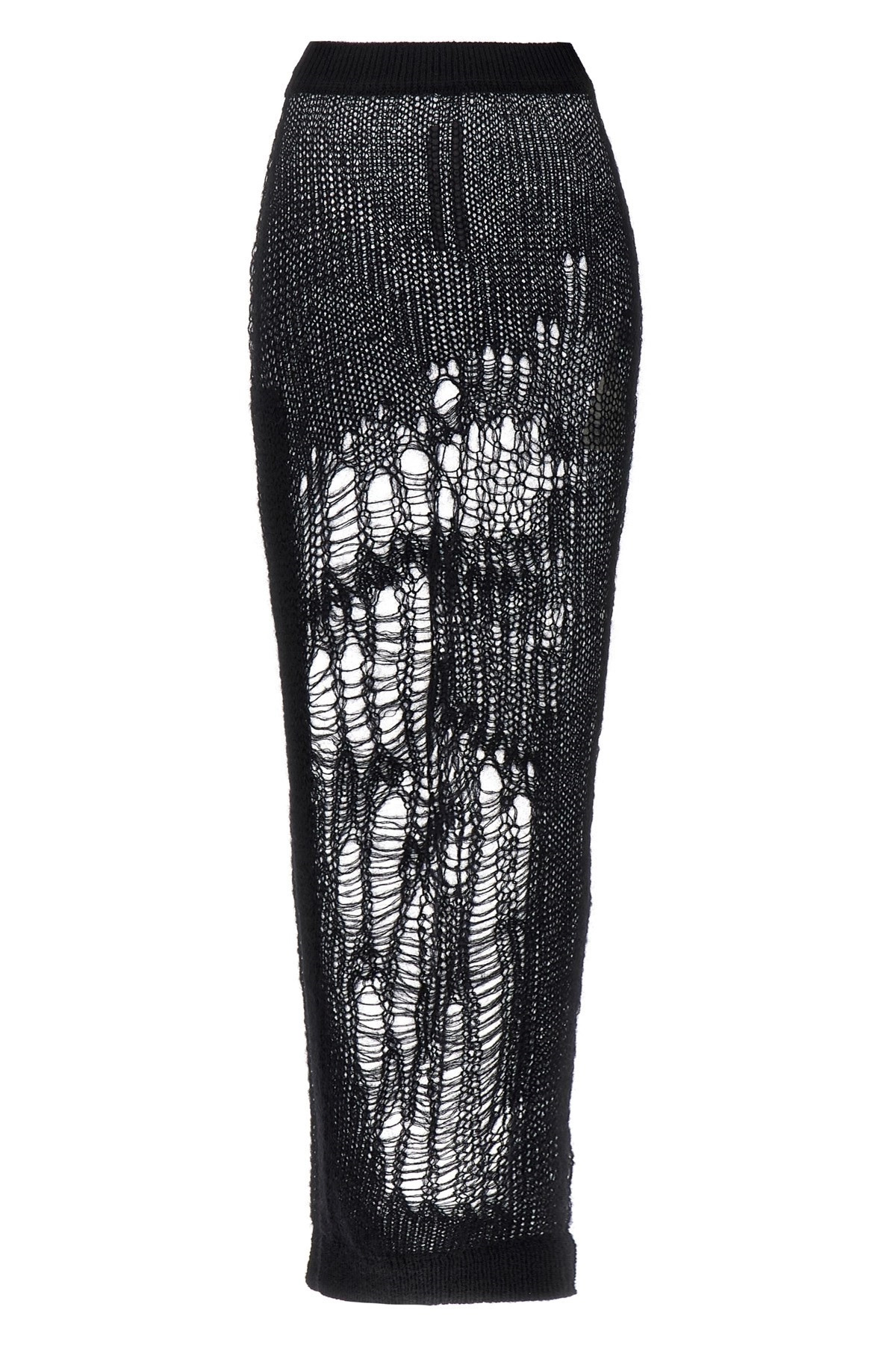 cod. RP01E7605KNETMH09 'Spider Ziggy' skirt in perforated mohair blend with elastic waistband and side split. Color: Black Size & Fit: true to size fit Composition: 50% nylon 46% mohair wool 4% wool Made in: Italy