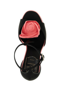 cod. RVW79743730UVM89ID 'Rose Vivier' sandals in satin and silk blend, contrasting floral decoration on the front, adjustable T-strap at the ankle with jewel buckle, lacquered plug heel, leather sole. Color: Black Size & Fit: EU WOMAN - Heel: 10 cm Composition: 68% viscose, 32% silk Made in: Italy