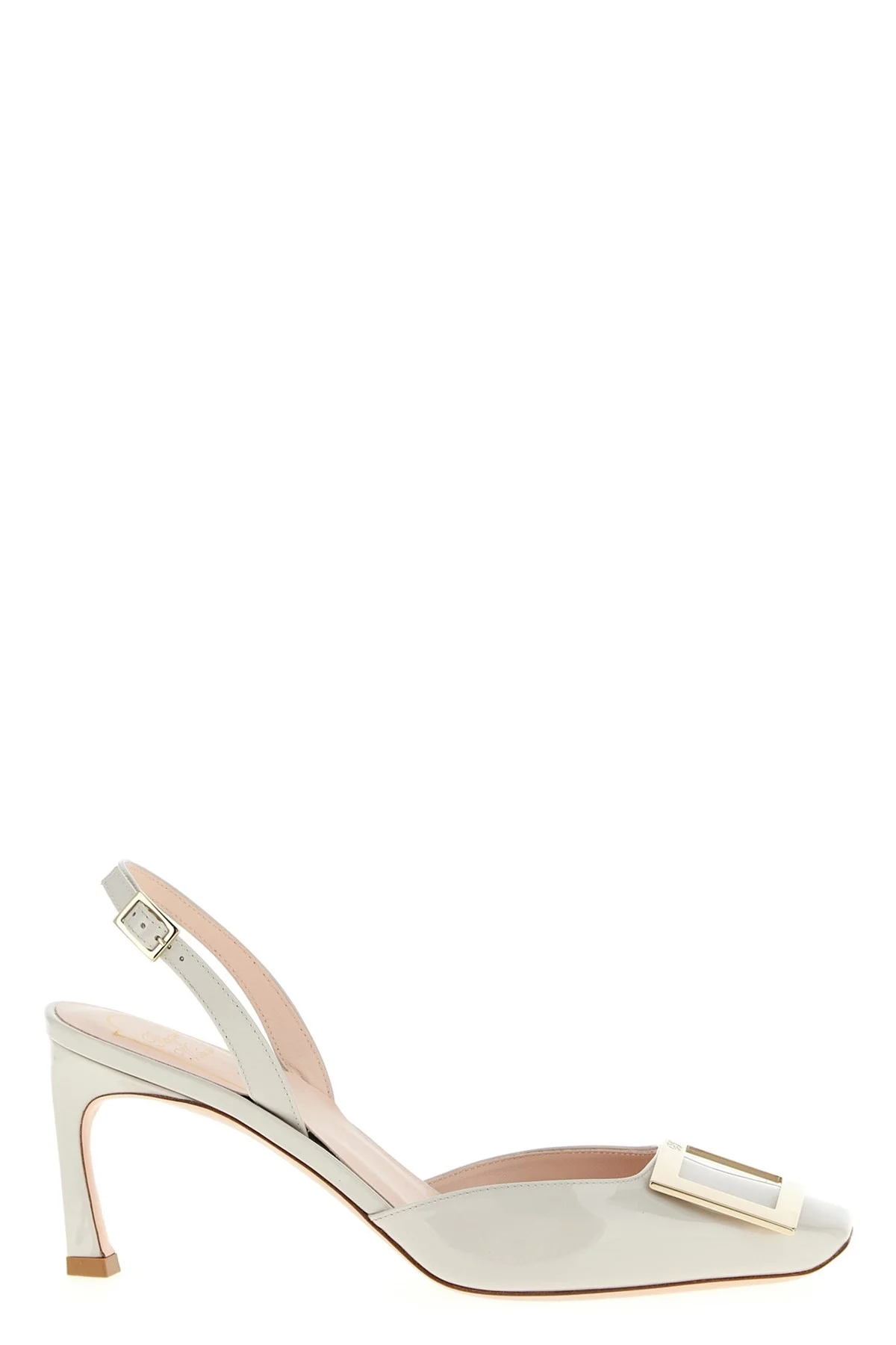 cod. RVW40037740D1PB017 'Trompette' patent leather slingbacks with square toe, metal front buckle, adjustable back strap, leather insole, leather sole. Color: White Size & Fit: EU WOMEN Heel:7 cm Composition: 100% calfskin leather (Bos Taurus) Made in: Italy