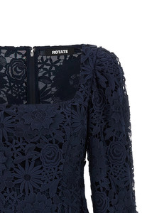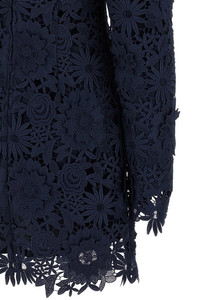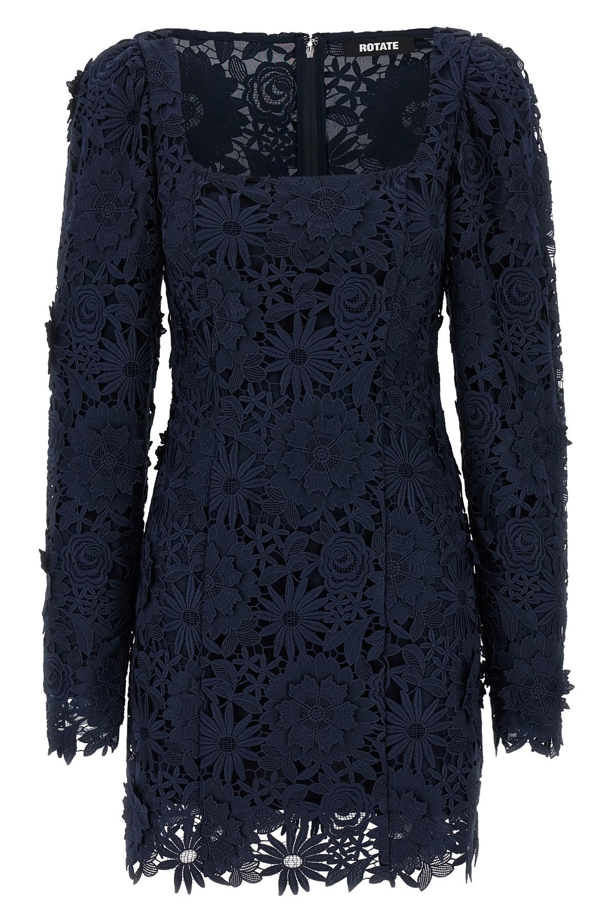 cod. 11503217251725 '3D Lace Ls Mini' floral lace dress with scalloped hem, square neckline, long sleeves, back zip closure, lining. SUSTAINABLE: Product made from recycled polyester. Color: Blue Size & Fit: true to size fit - GERMAN size Composition: 100% polyester Made in: China
