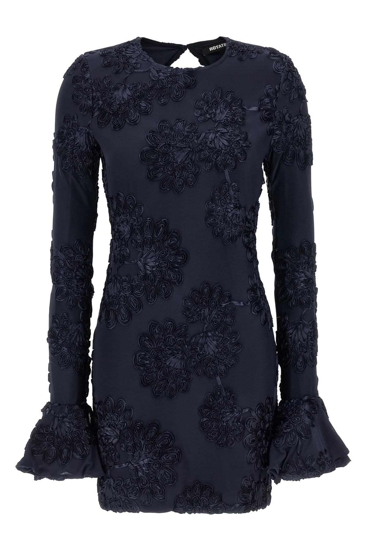 cod. 114218340340 Mesh '3D Mesh Mini' dress with tonal 3D floral applications, crew neck, back button closure with cut-out teardrop detail, long sleeves with flared cuffs and ruffles, side zip closure, lining. SUSTAINABLE: Product made from recycled polyester. Color: Blue Size & Fit: slim fit - GERMAN size Composition: 95% polyester, 5% elastane Made in: China