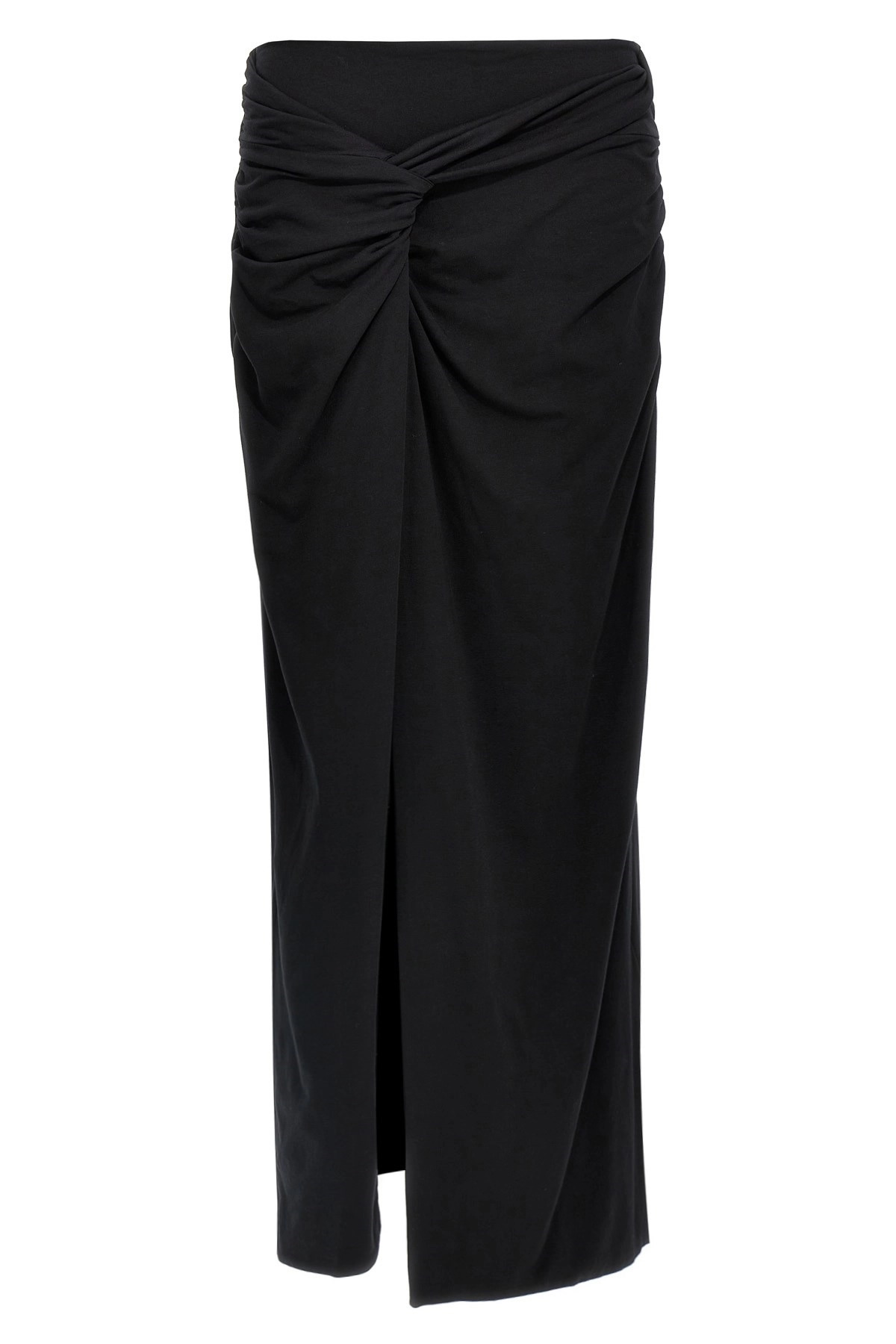 cod. 112878100100 Mini 'Fitted Twisted' skirt in stretch cotton blend, front knot detail with side curls and a wide split. Color: Black Size & Fit: true to size fit GERMAN size Composition: 48% co, 48% md, 4% ea Made in: Turkey