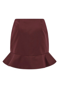 cod. 11481927342734 Satin mini skirt, front and back pincer, side zip closure, lining, flounce on the hem. Color: Bordeaux Size & Fit: true to size fit - GERMAN size Composition: 100% polyester Made in: China