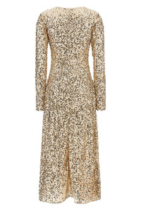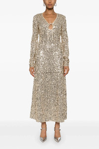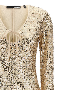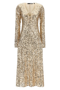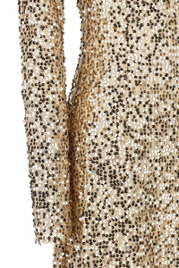 cod. 11262615311531 'Net Sequins Midi' dress in mesh fabric covered with sequins, V-neck with tie cord, long sleeves, side zip closure. Color: Gold Size & Fit: true to size fit German size Composition: 100% polyester Made in: China