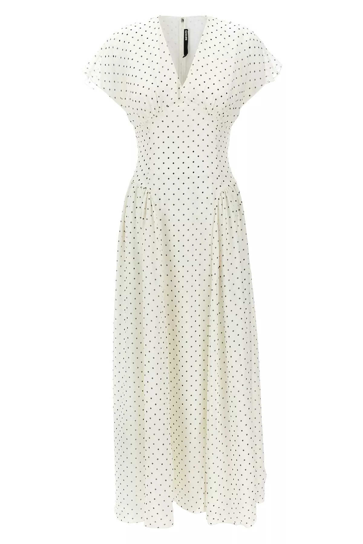 cod. 114227857857 Polka dot fabric maxi dress, V-neck, ruffle sleeves, back zipper closure.ure. Color: White/Black Size & Fit: True to size fit german size Composition: 100% polyester Made in: China