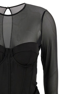 cod. 115252100100 'Satin Corset Mini' dress consisting of semi-transparent mesh top and satin bottom, round neckline with back button closure and wide teardrop cut-out, long sleeves, corset construction partially attached to the skirt, preformed cups, splints, front and back draping, back zip closure. Color: Black Size & Fit: true to size fit - GERMAN size Composition: 100% polyester Made in: China