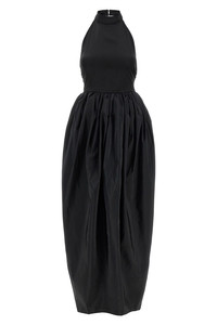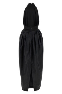 cod. 115242100100 'Satin Taffeta Maxi' satin taffeta dress with American neckline with bare back, high neck with back button closure, sleeveless, tight bodice with voluminous skirt curled at the waist, zip closure and back split. Color: Black Size & Fit: true to size fit - GERMAN size Composition: 100% polyester Made in: China